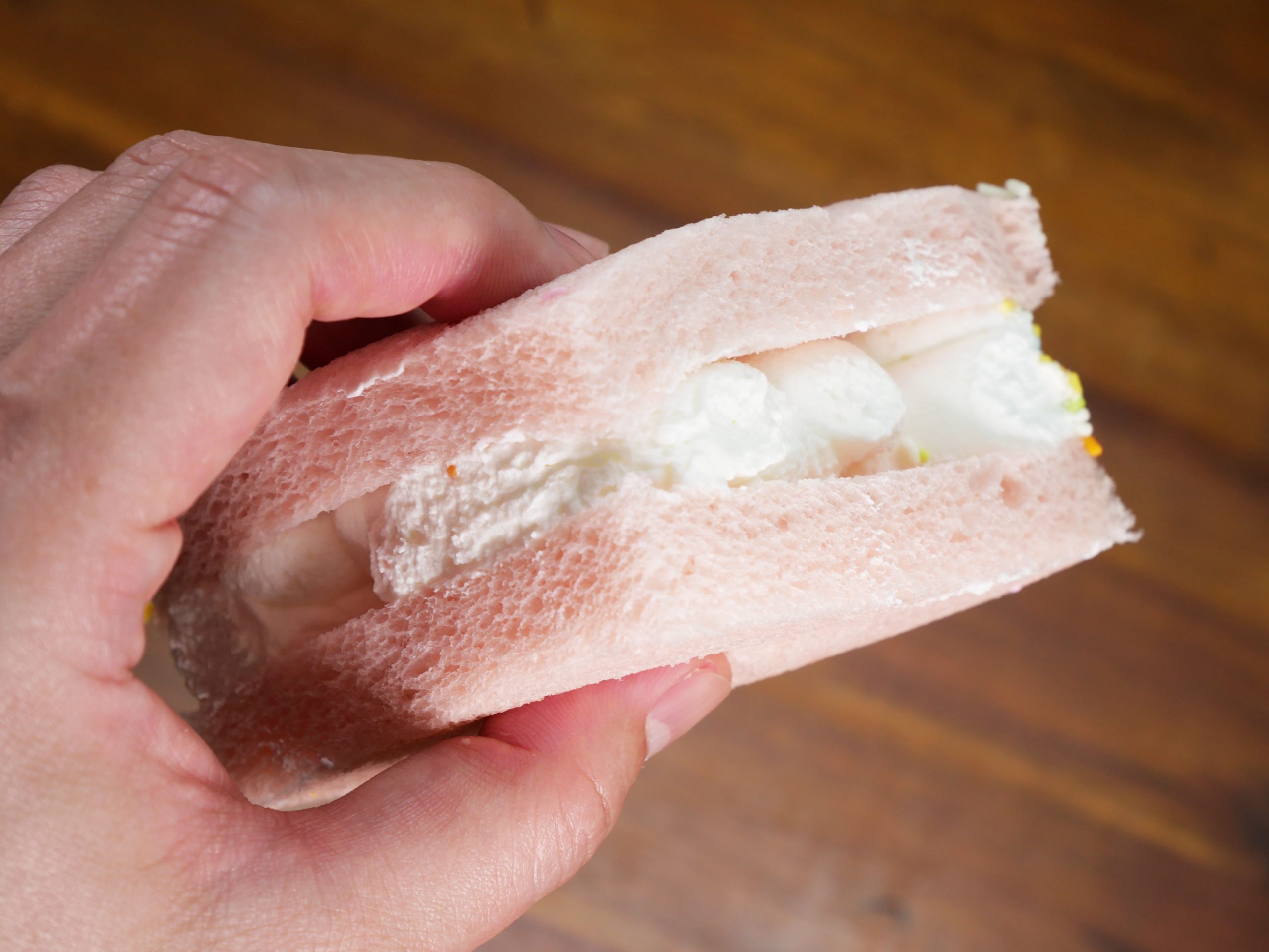 その味、極めて甘美。たっぷりとなめらかな甘いホイップクリーム。ほのかに酸味ある食パンが、ホイップクリームの甘さでより強調された爽やかな酸味に。そしてカラーチョコの心地よいチョコレートテイスト。まさにスイーツ系サンドイッチとして完成形がそこにある。ごちそうさまでした!!