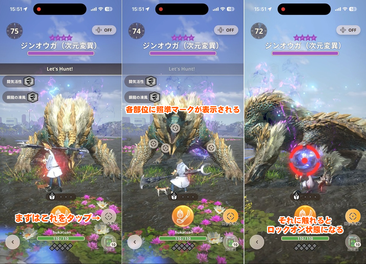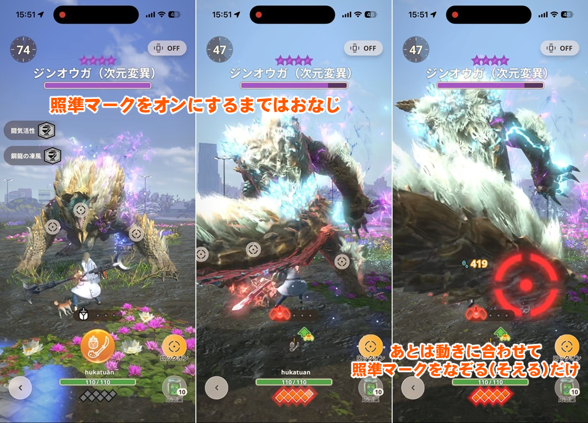 そのため、脚や尻尾など照準マークの動く方向に合わせて画面をなぞる、もしくは指をそえておけばロックオンできる。