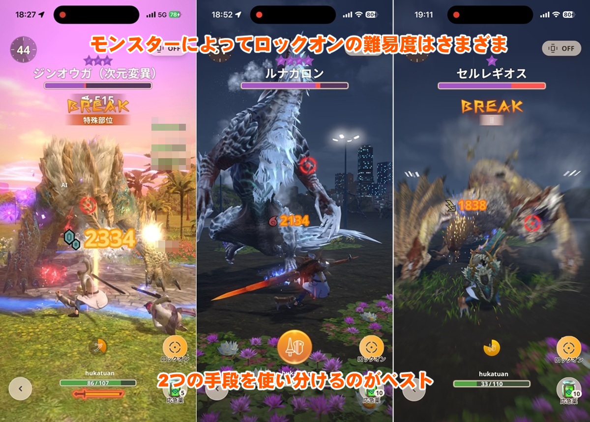 同じモンスターでもスムーズに狙った部位をロックオンできることもあれば、異なる部位ばかり触れてもたつくことも多々ある。