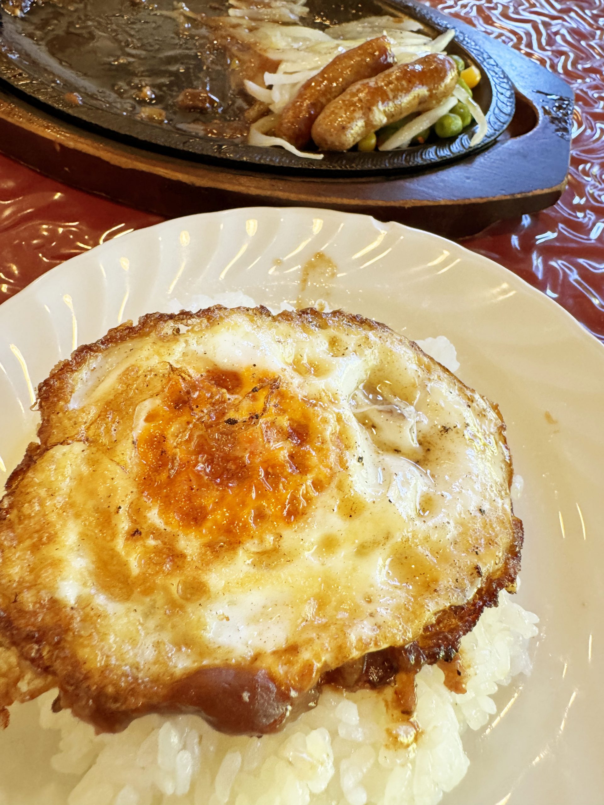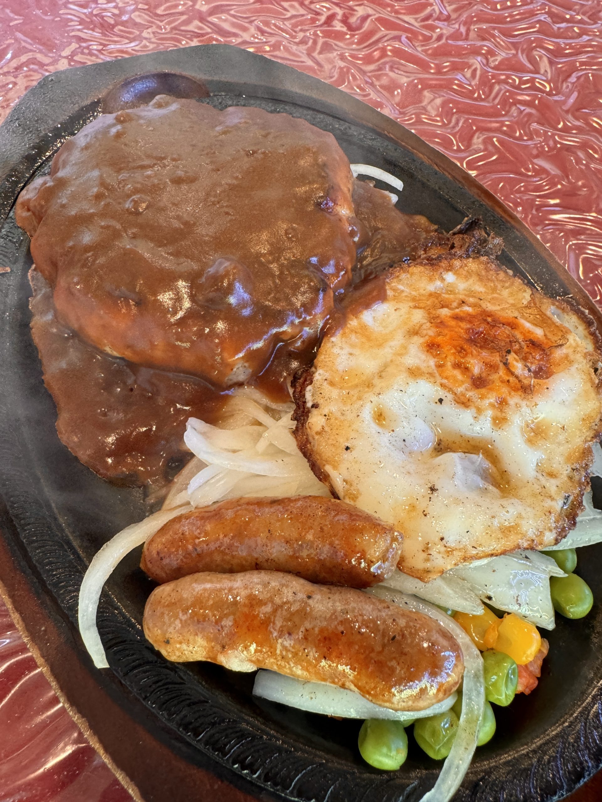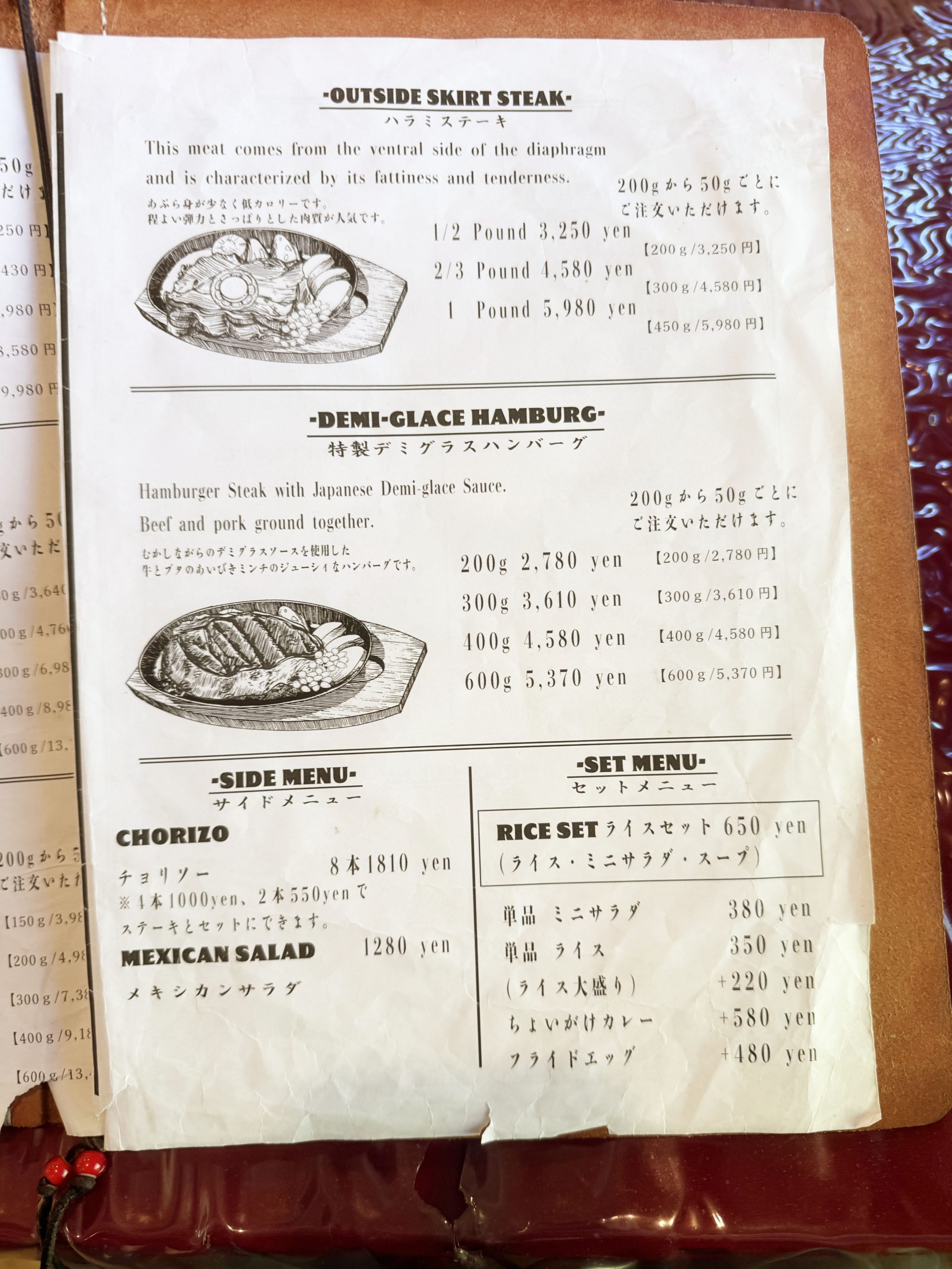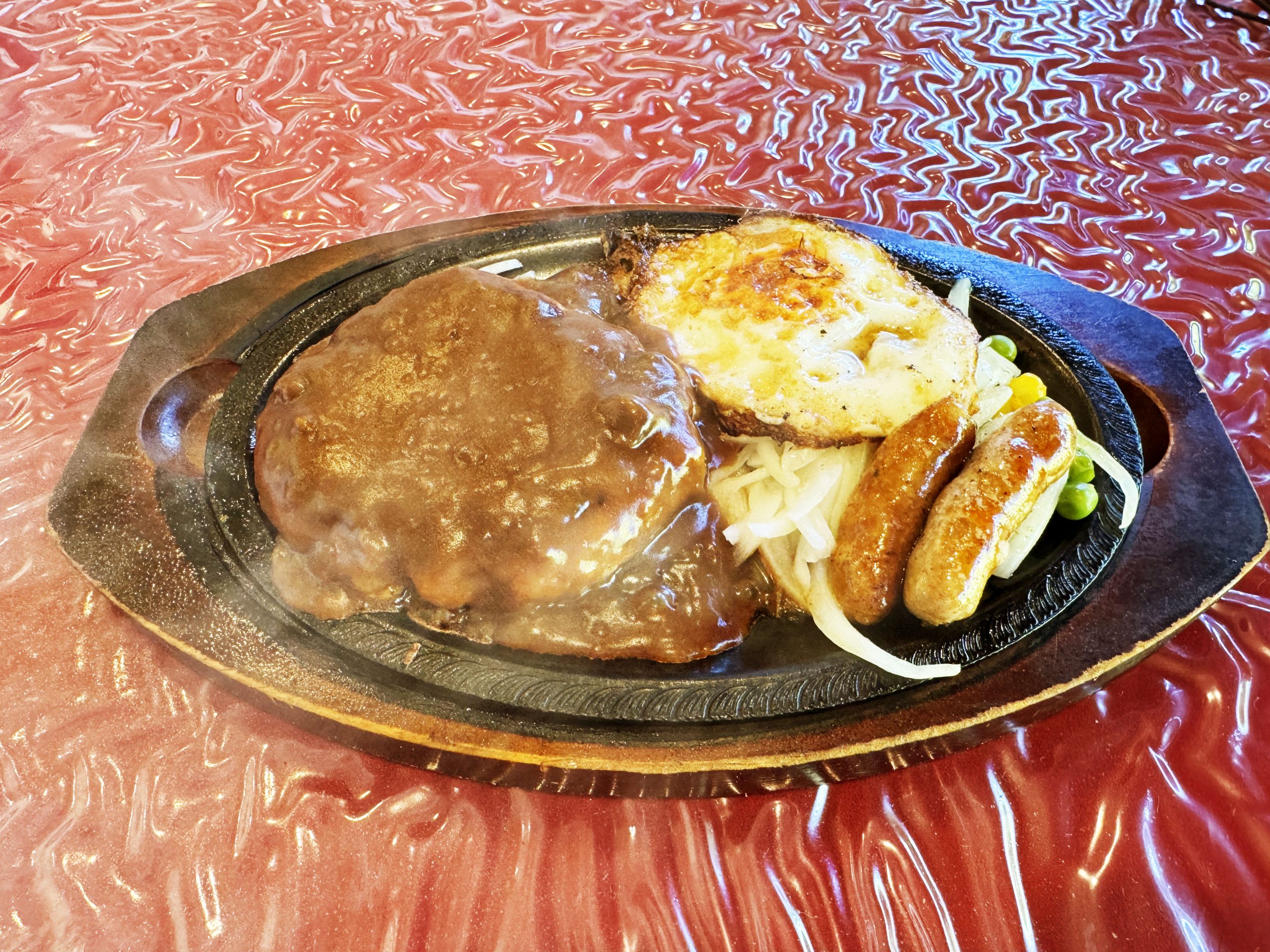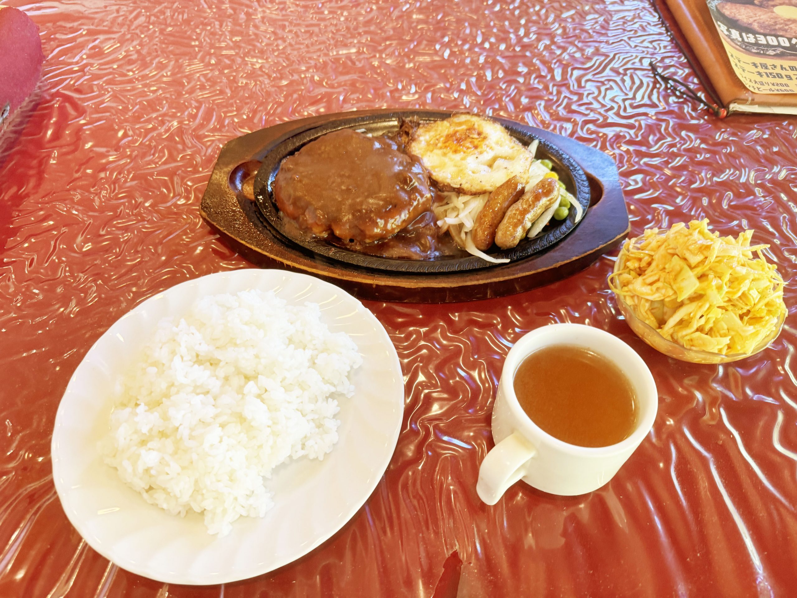 メニューはとても豊富で、ステーキは部位が複数用意されていて、好みによって選ぶことが可能。しかもハンバーグもある。つまりパシモンに行けば、極上のステーキとハンバーグをダブルで堪能できるということになる。ということで、まず最初に特製デミグラスソースのハンバーグ200グラムのライスセットをオーダーすることにした。有料トッピングとしてフライドエッグとチョリソーソーセージ2本も追加。
