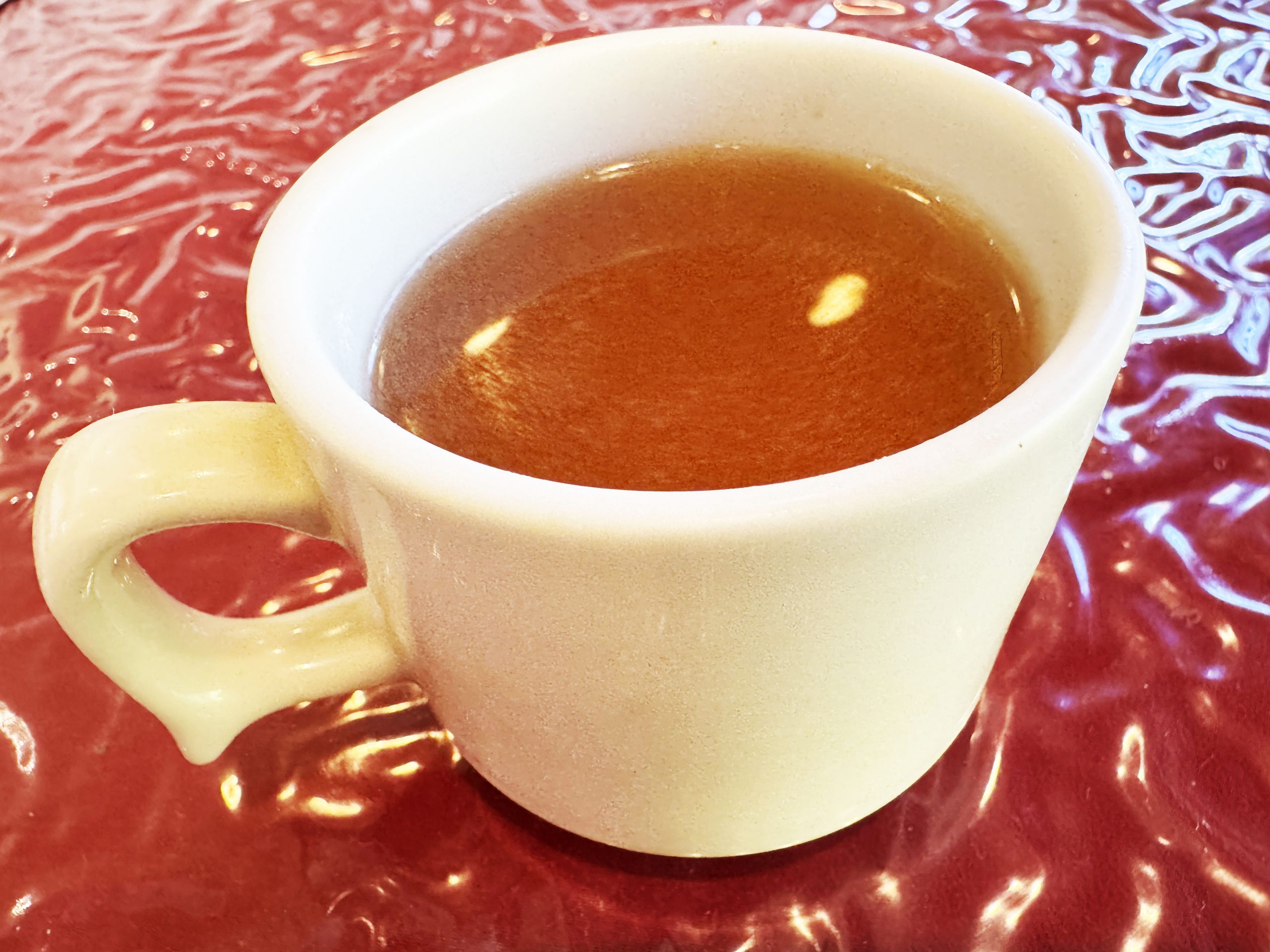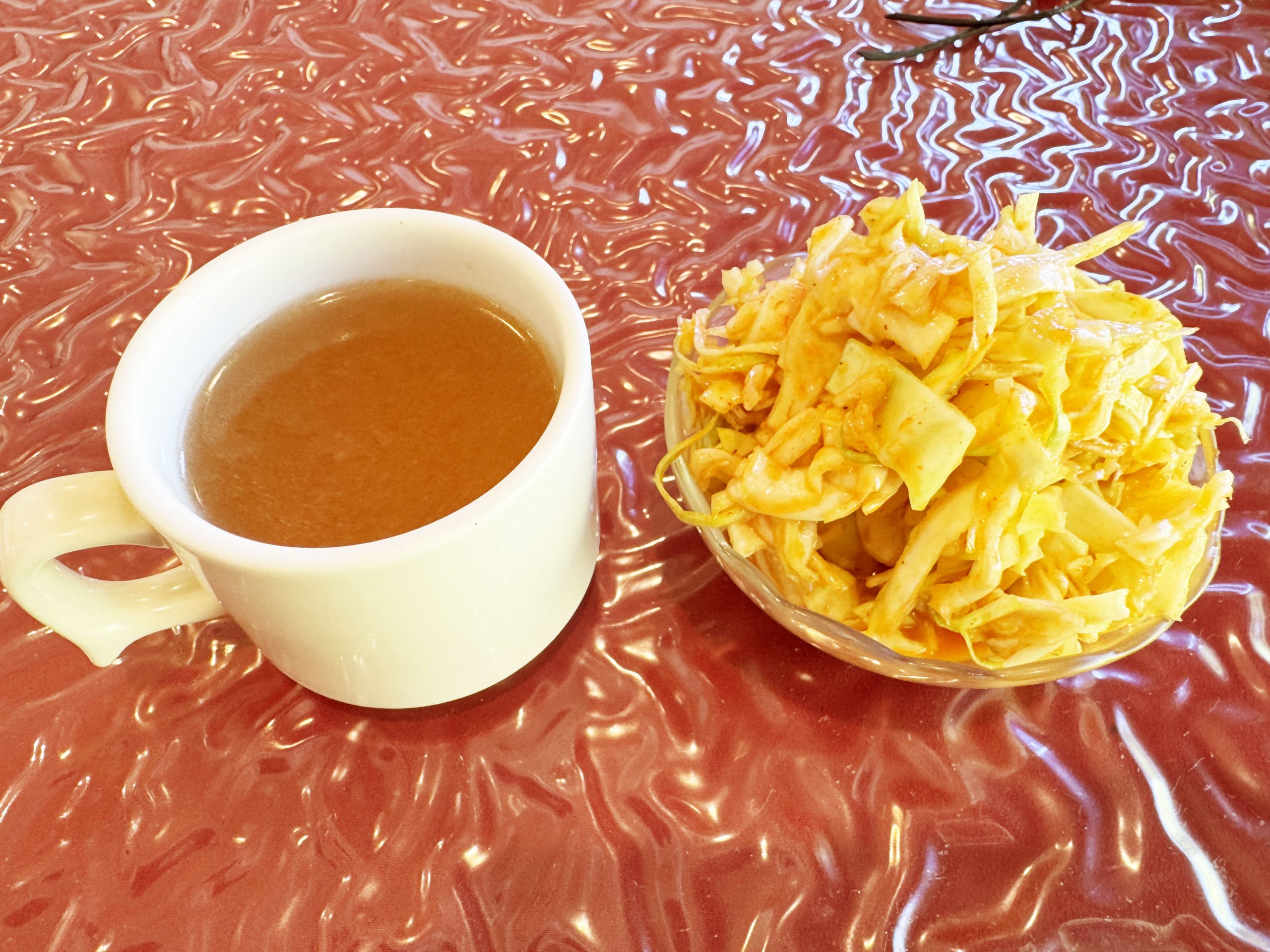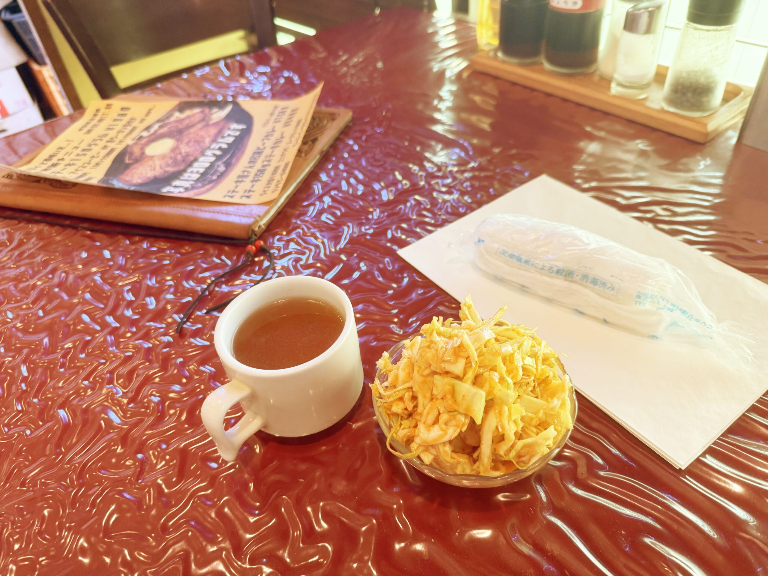 パリシャキッとフレッシュな食感のキャベツに、たっぷりとまろやかなドレッシング。これがもう、食べ始めたらやめられない、止まらない。永遠にこの「パリシャキ!」を感じ続けたい。そのおいしさ主役級。器に山盛りで入っているので、食べ応え十分だ。もちろん、薫り高いスープもウマイ。このスープ、絶対にライスとハンバーグにマッチするもの。