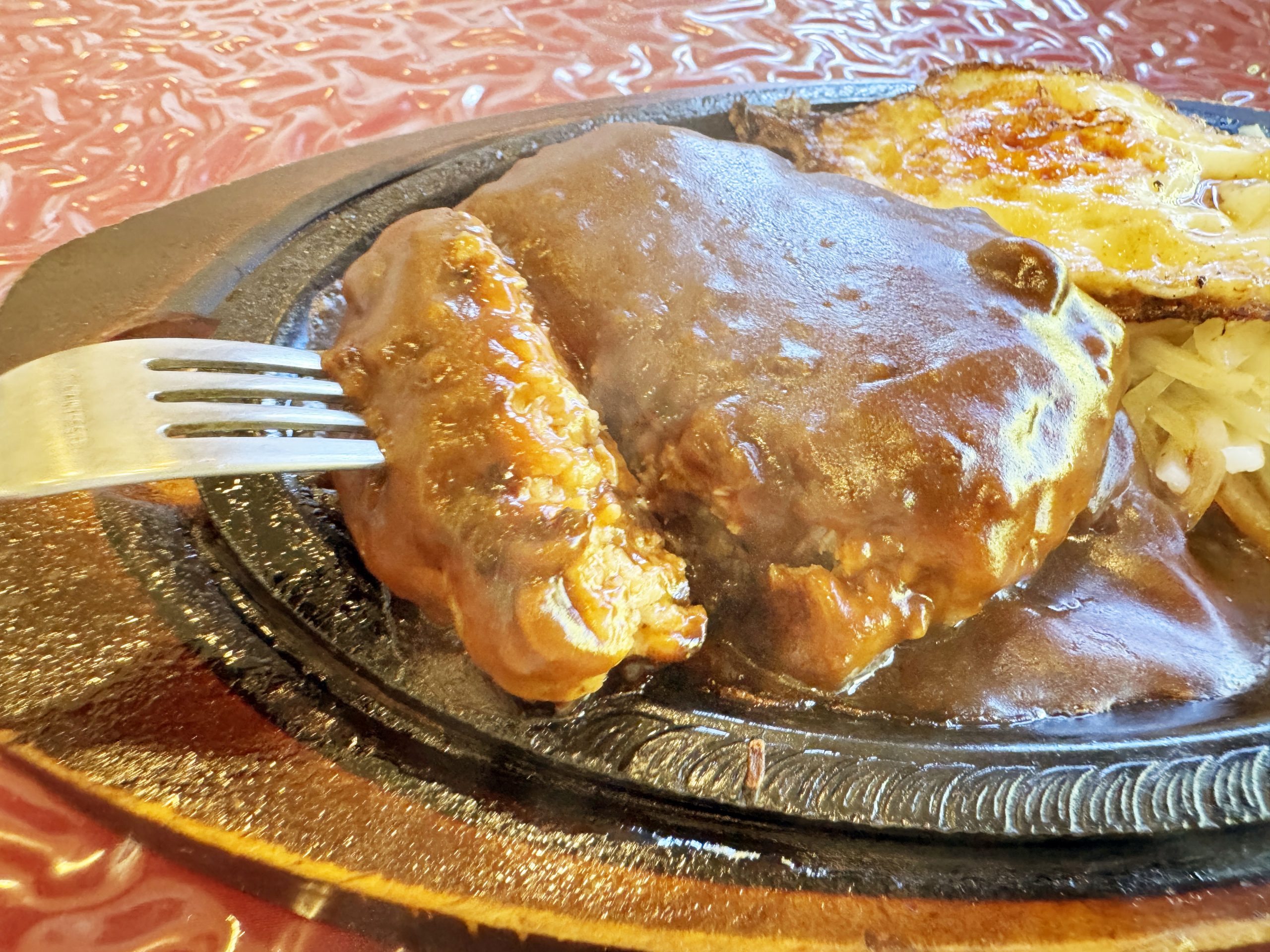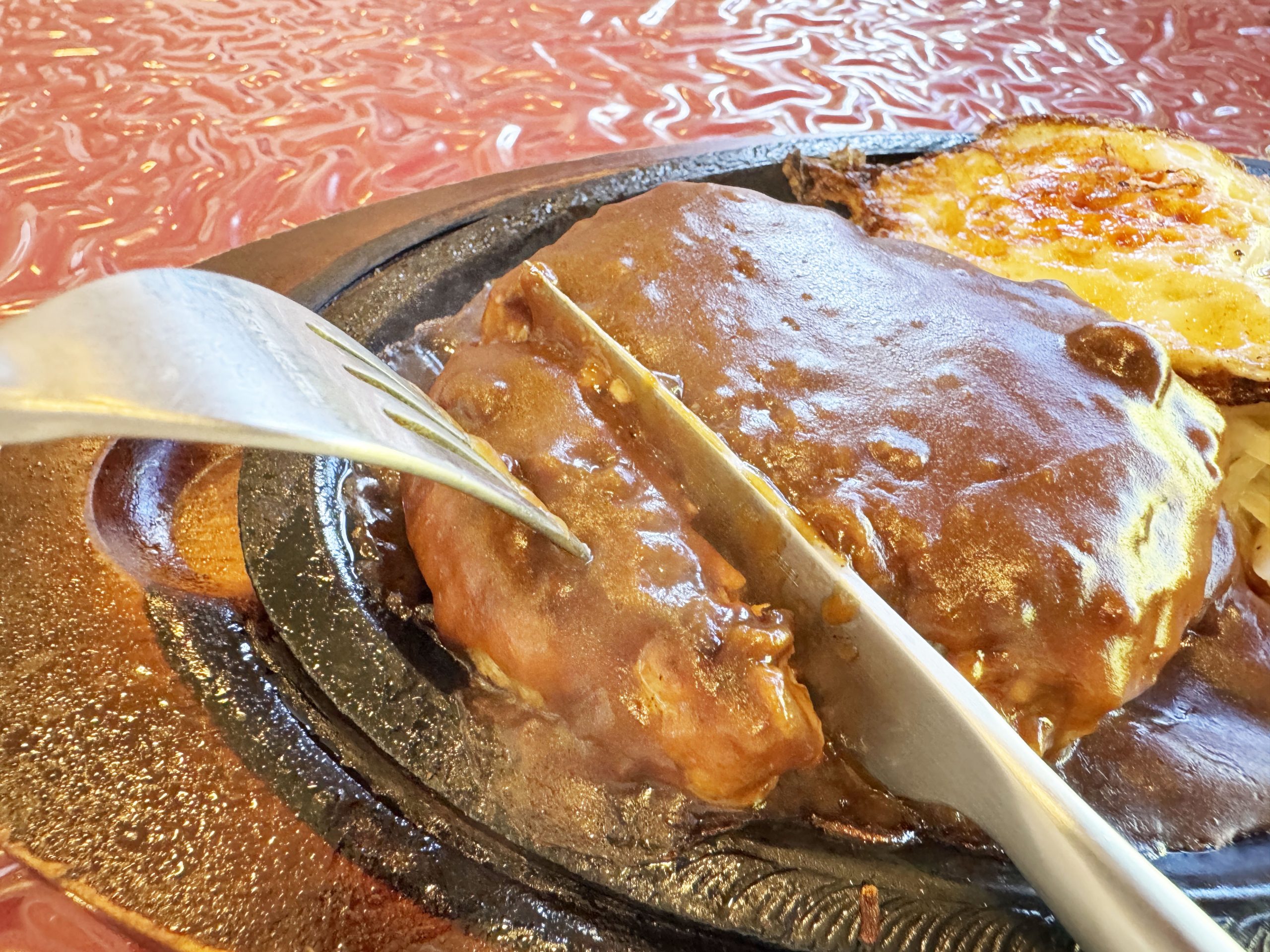 目の前にやってきたハンバーグは、あまりにも魅力的な湯気と煙と薫りを放っていた。熱々の鉄皿で焼かれており、ジュウジュウと「絶対おいしい音」を放ちながら特製デミグラスソースと肉汁がフットーしている。このフットーは目視的・聴覚的にご褒美。永遠に聞いていたい音、そして永遠に見ていたいフットー。