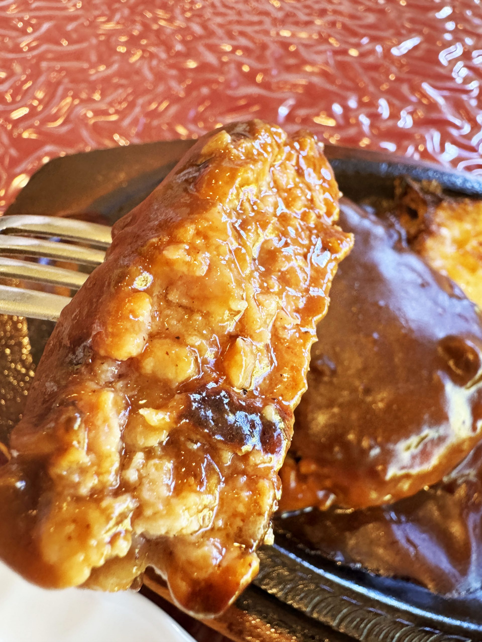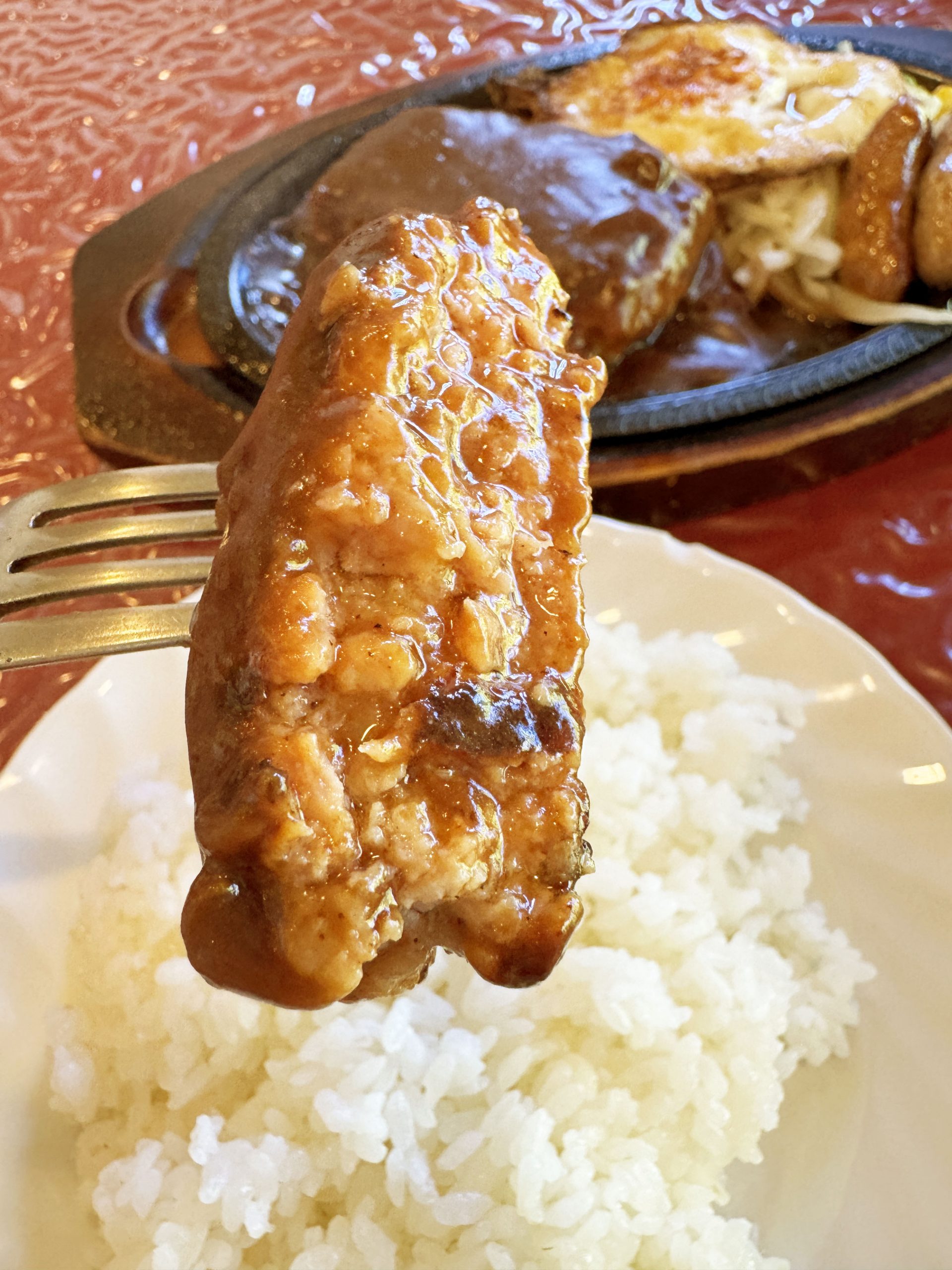 ナイフでカット。思った以上にふわっふわで、驚くほど柔らか。いいのか、こんなにも柔らかくて。いいのか、こんなにも柔らかいハンバーグがこの世に存在して。たっぷりと特製デミグラスソースをまとったハンバーグの味、これ本当にヤバウマ、ゲキウマ、マジウマ。
