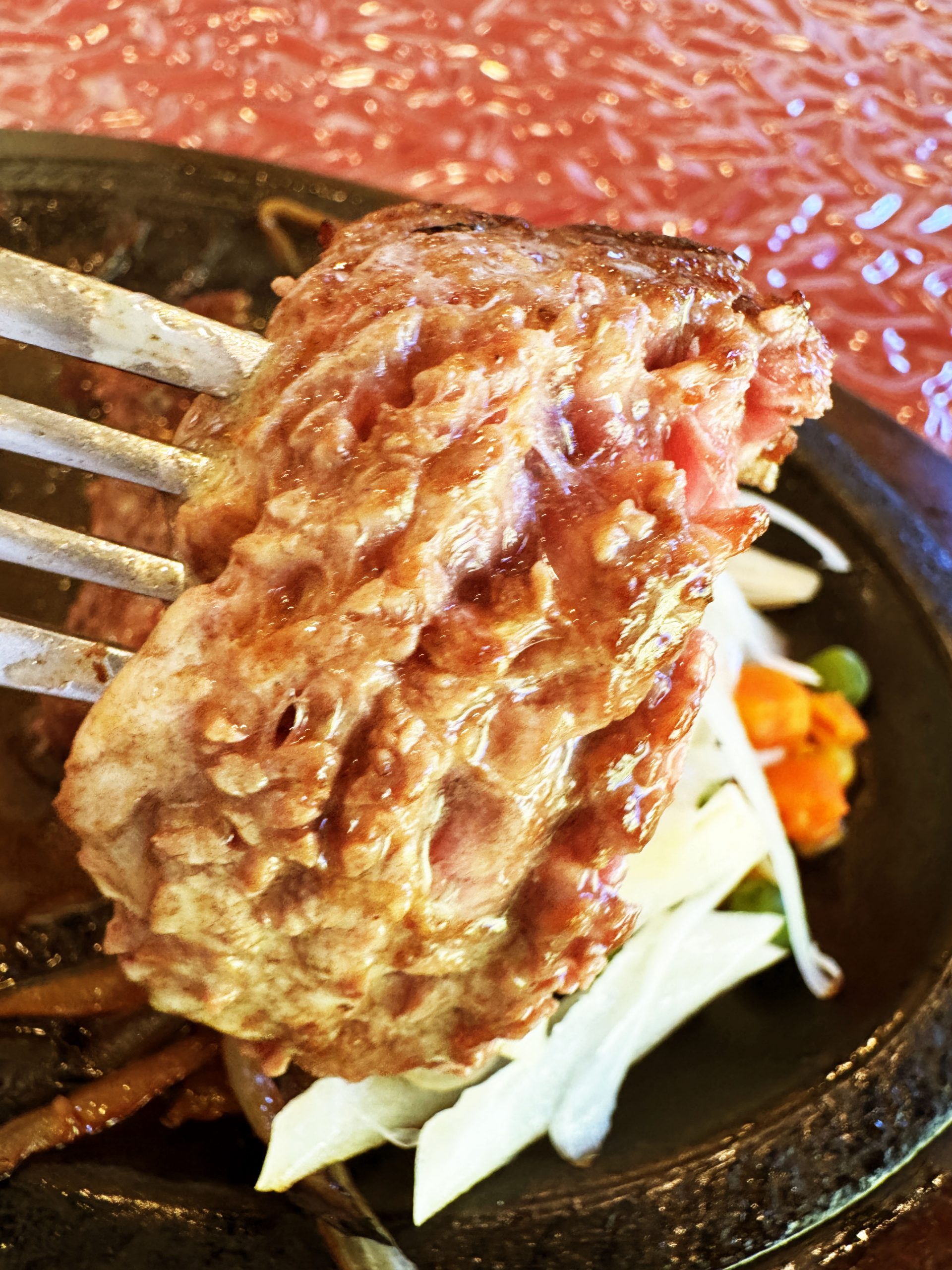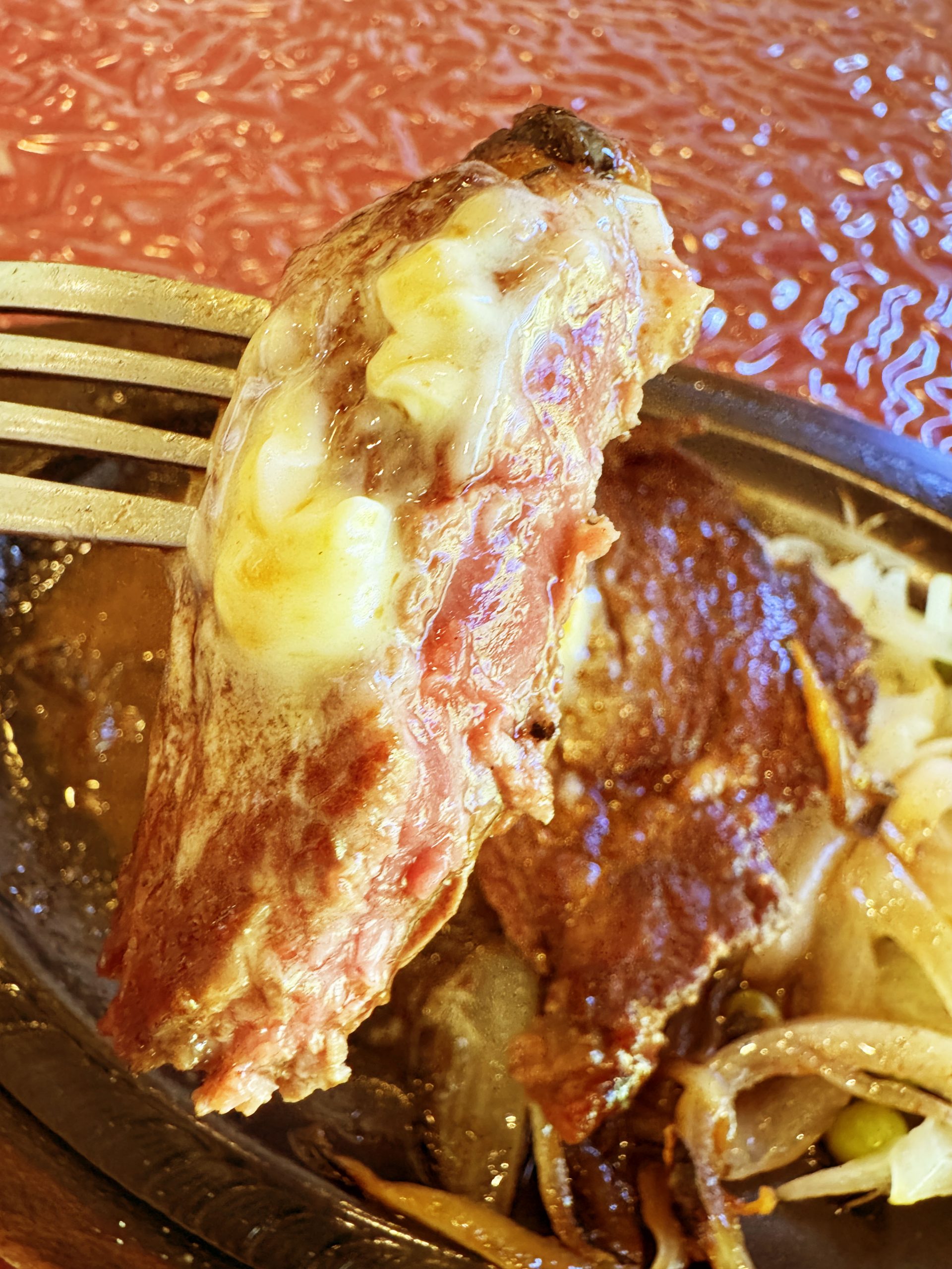 ただでさえ鉄皿でジュウジュウと音を放ちながら焼かれているステーキ。