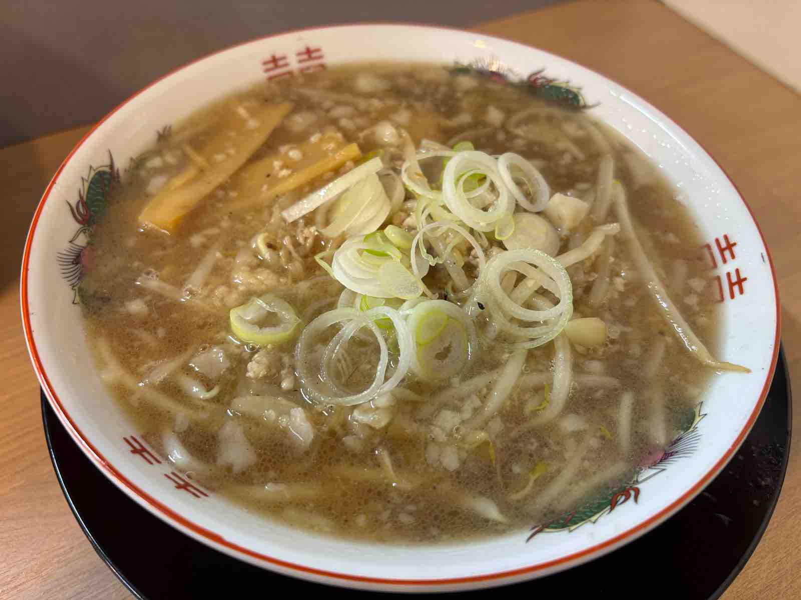 具はモヤシ、ひき肉、チャーシュー、メンマ、ネギ。麺は中縮れの札幌風の麺。