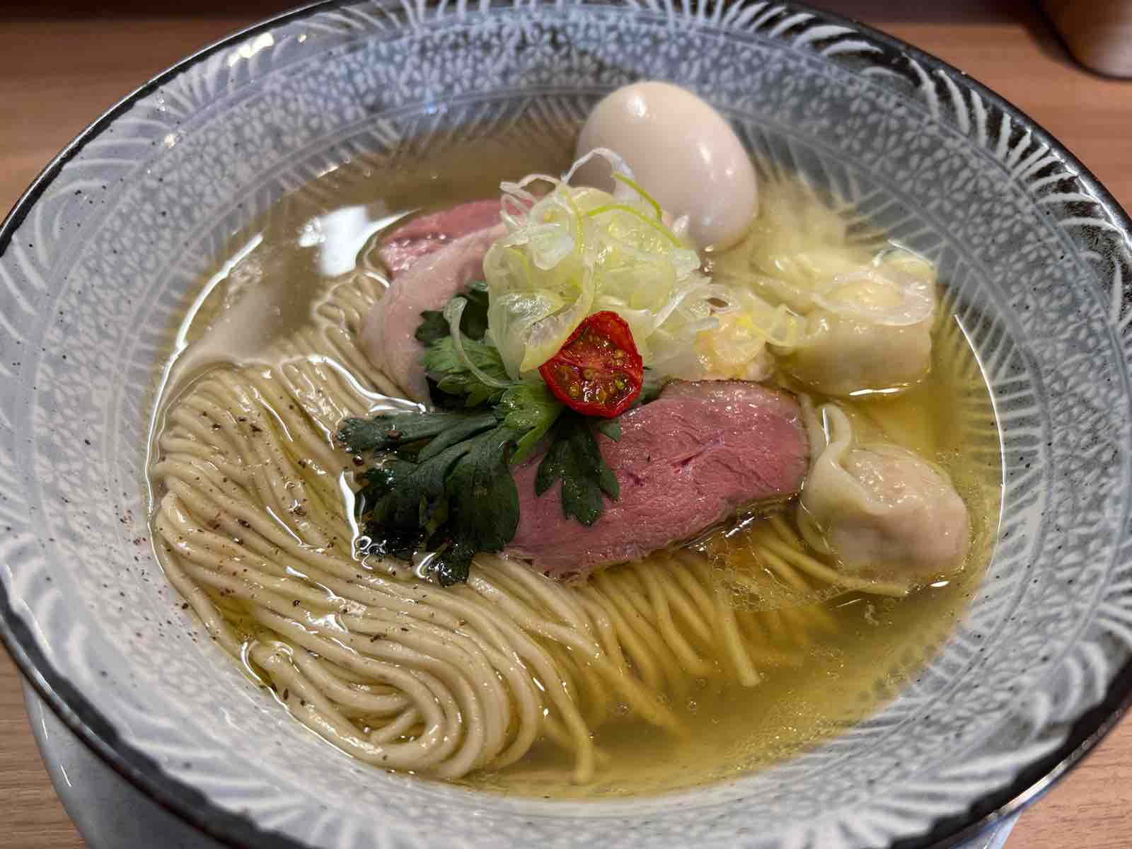 スープは山口県長州黒かしわ、熊本県天草大王のコンソメ風スープで、塩6種類と乾物など20種類の素材を使用した塩ダレを合わせている。芳醇で香り高い。