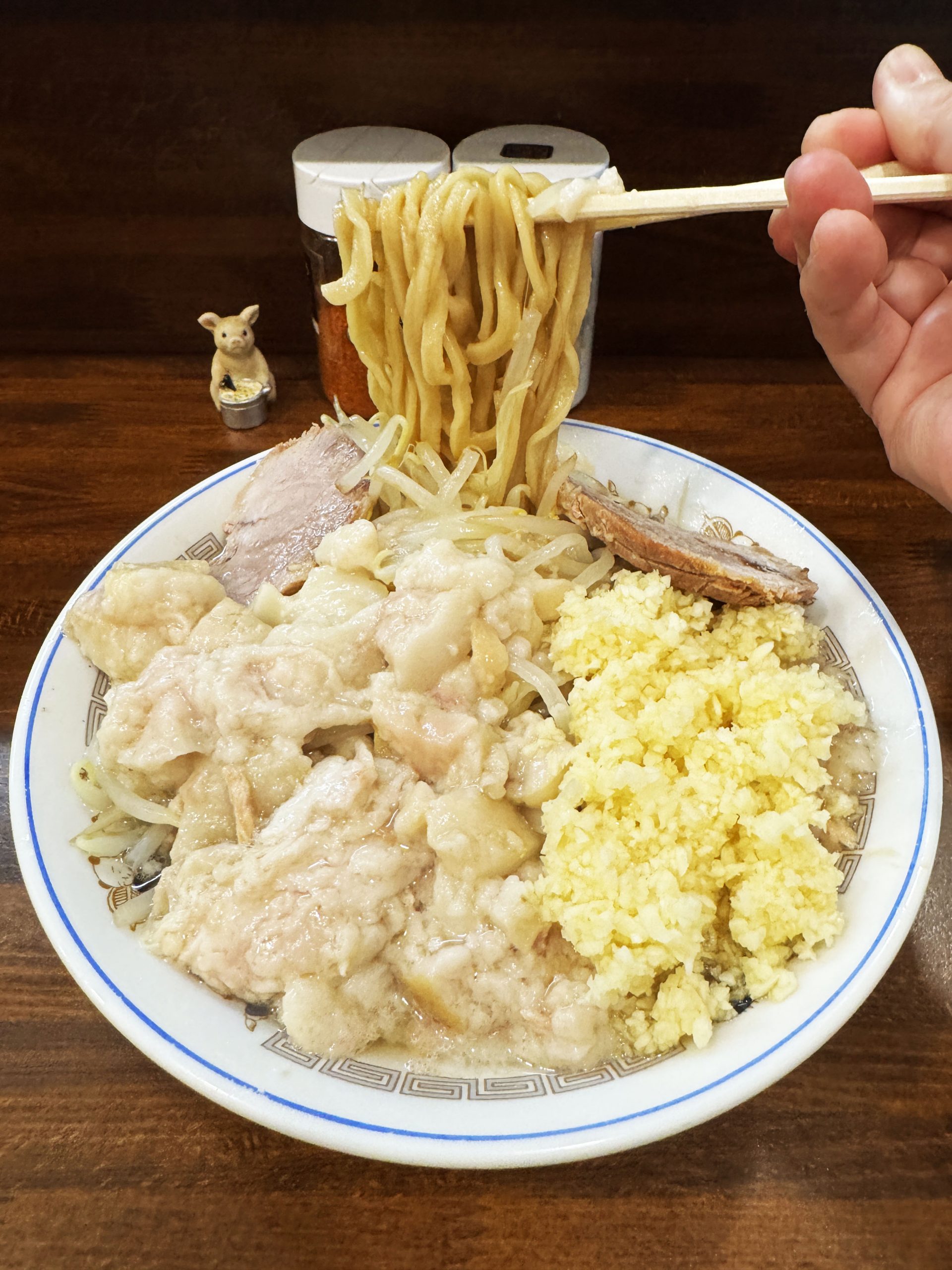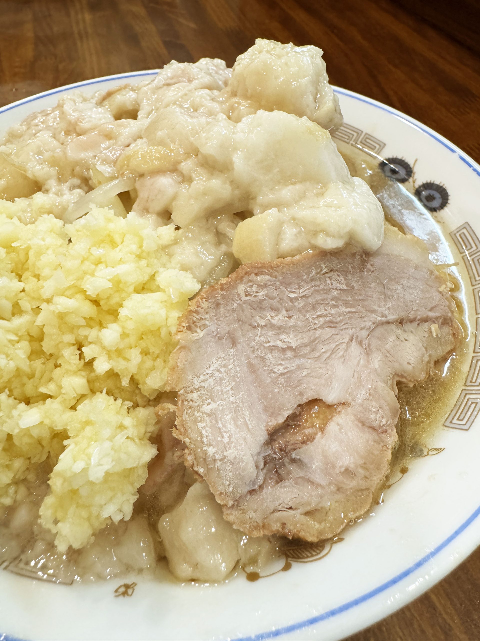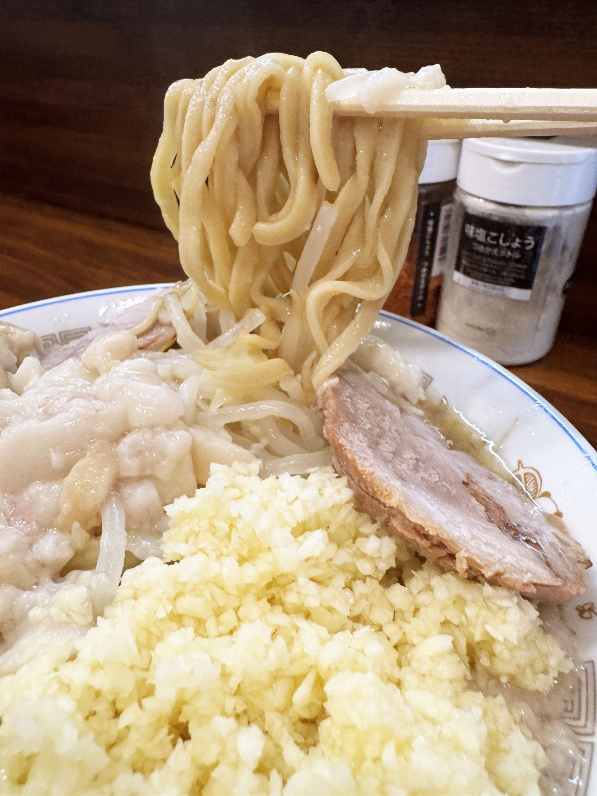 たっぷりとアブラをまとった麺はこの世のものとは思えないまろやかさ。そしてそのベースには女神的旨味がディープに存在している。後半、大量のニンニクをスープと一体化させ、一気にパワフルテイストにメガ進化。しかしパワフルとはいっても、濃い旨味とまろやかテイストがパワフルに強調されるのであり、味にくどさは皆無。徹底して優しく、徹底して旨味が濃密。