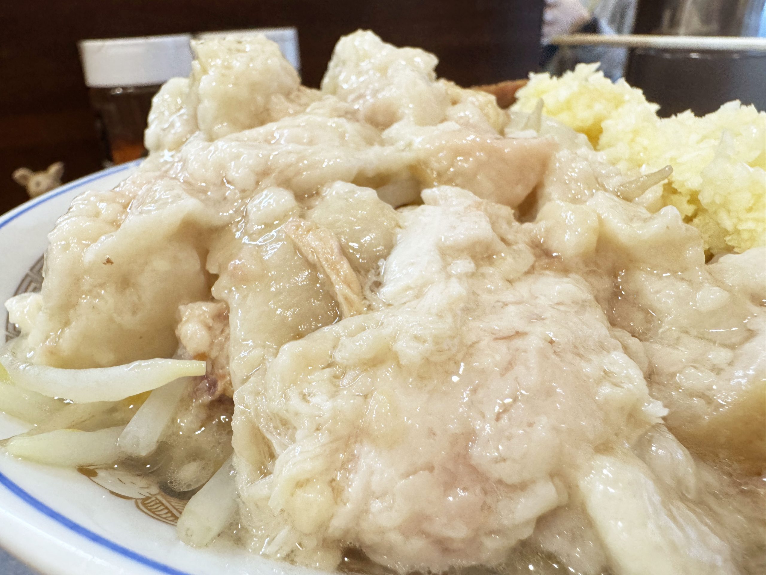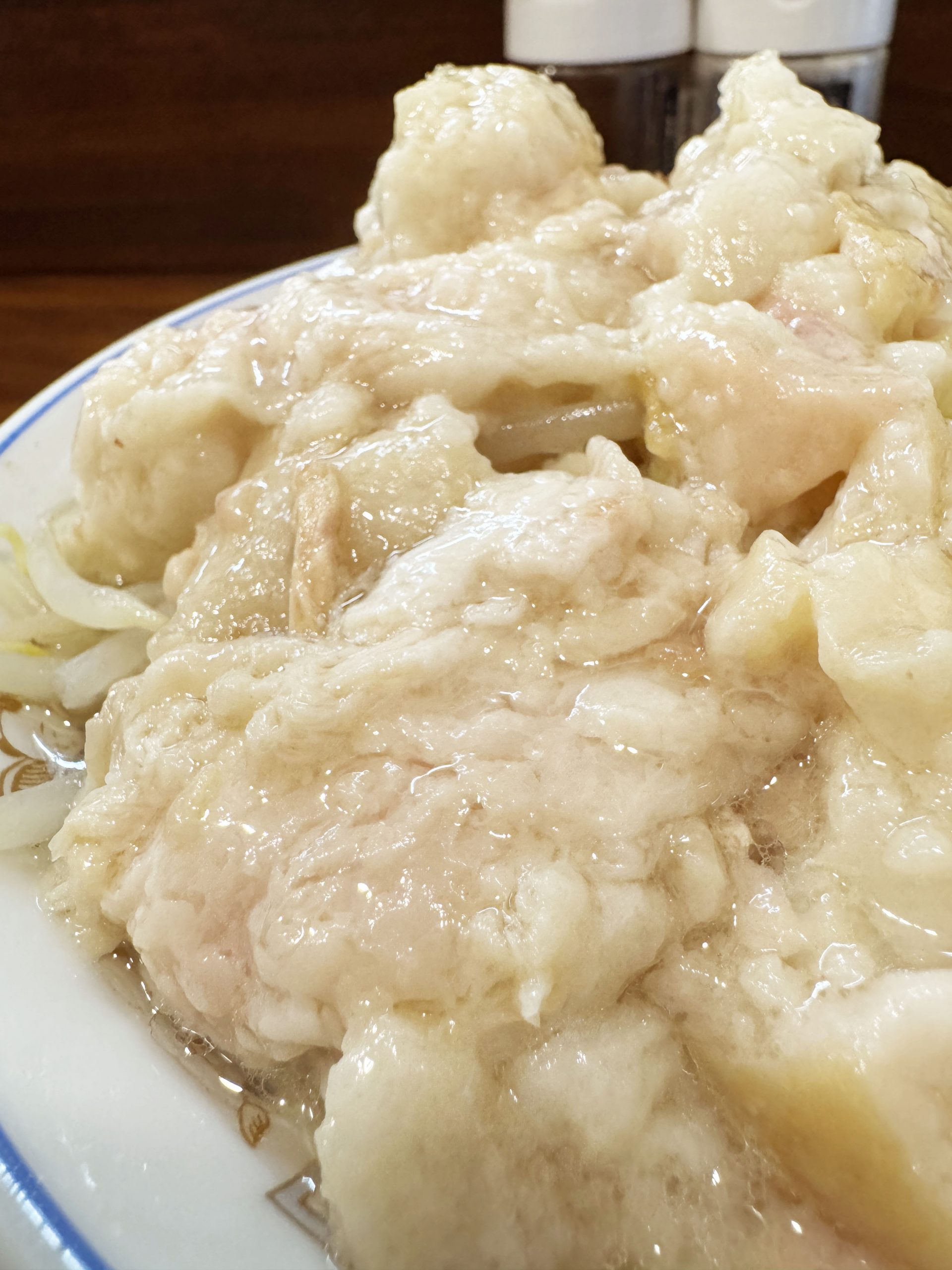 ヤサイをかきわけて麺をサルベージ。そこに姿を現した麺は、スープの濃淡が模様となっており、食べる部分によって塩味・旨味・薫りに違いが生まれている状態。それをズズッとすすれば、そこにあるのはディープすぎる旨味のグラデーション。スープが徹底的に包容力のあるデキで、いっさいの雑味ナシ、バランス崩れナシ、飽きナシ。まさに永遠にすすっていられる究極的な仕上がり。