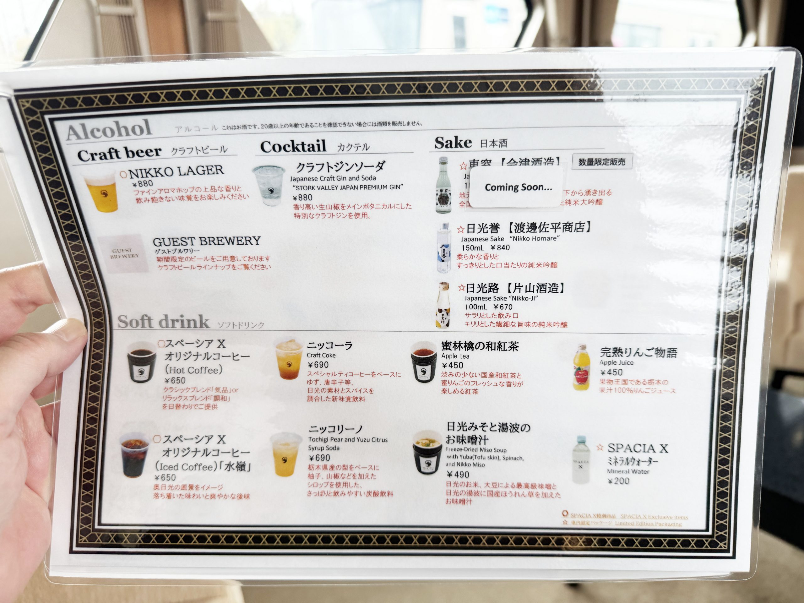 ラウンジでは複数のドリンクが販売されていて、そのなかにスペーシアX限定ビール「日光ラガー」(NIKKO LAGER)と「シダーX PA」(Cedar X PA)があります。スペーシアX特別醸造「スペーシアXセッション」(SPACIA X SEEION)も希少なビールです。