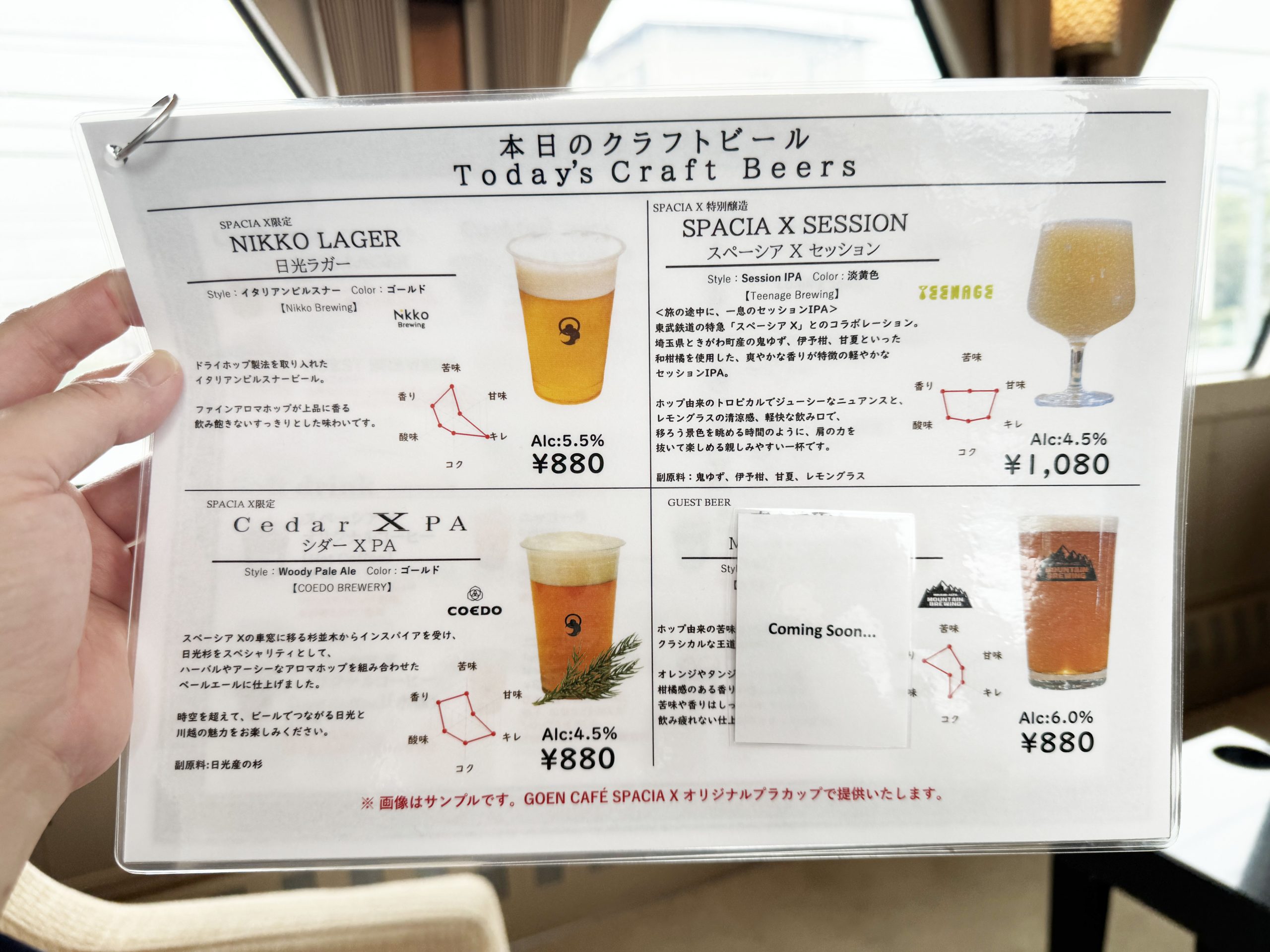 ちなみに、スペーシアXで売られているビールは日によって違うこともあるようです。今回は1種類が販売されていませんでした。つまり、何度も乗ってすべてのビールをコンプリートするというのも楽しそう。東武鉄道のスペーシアXのビール旅、楽しいですよ!