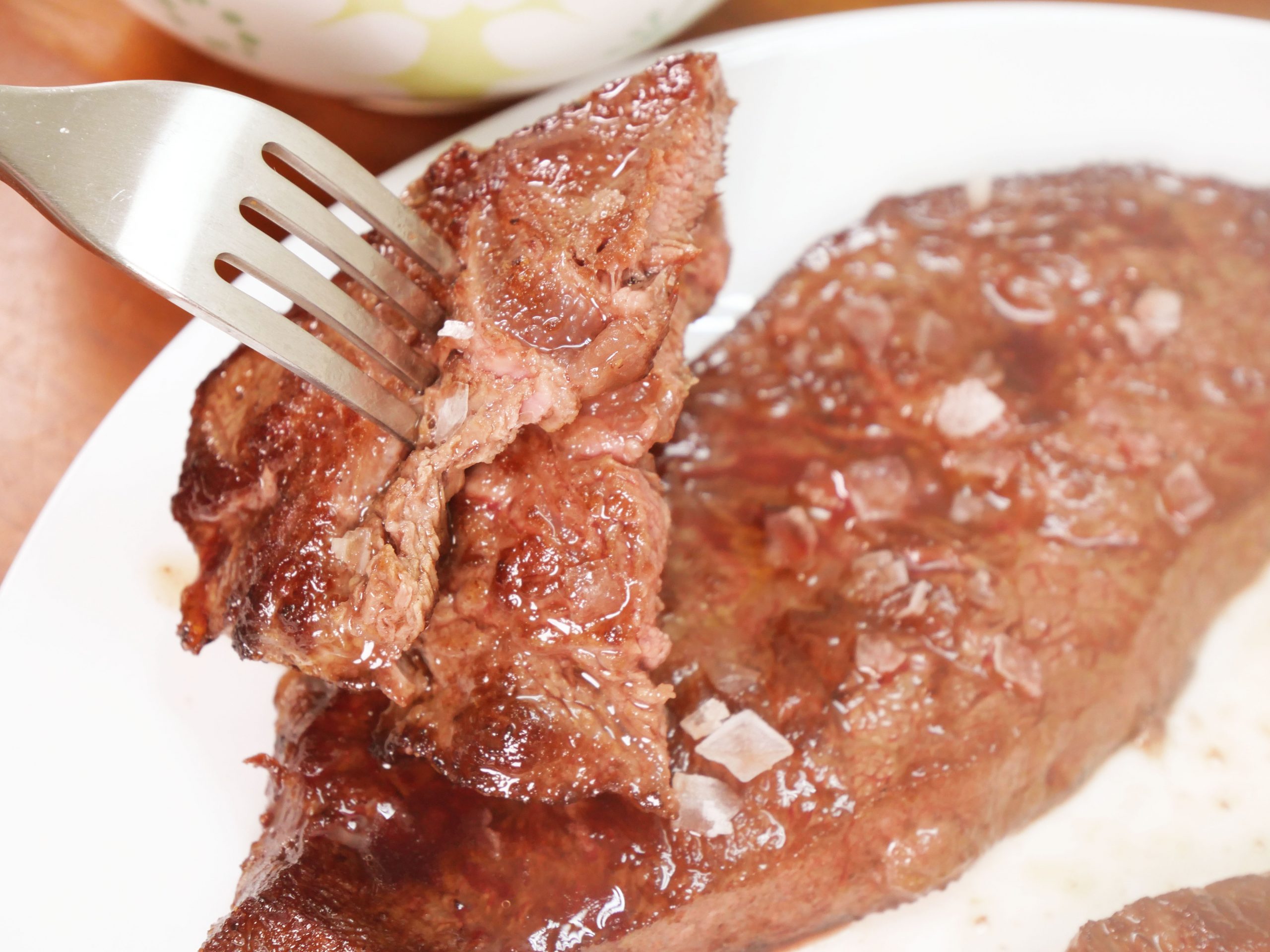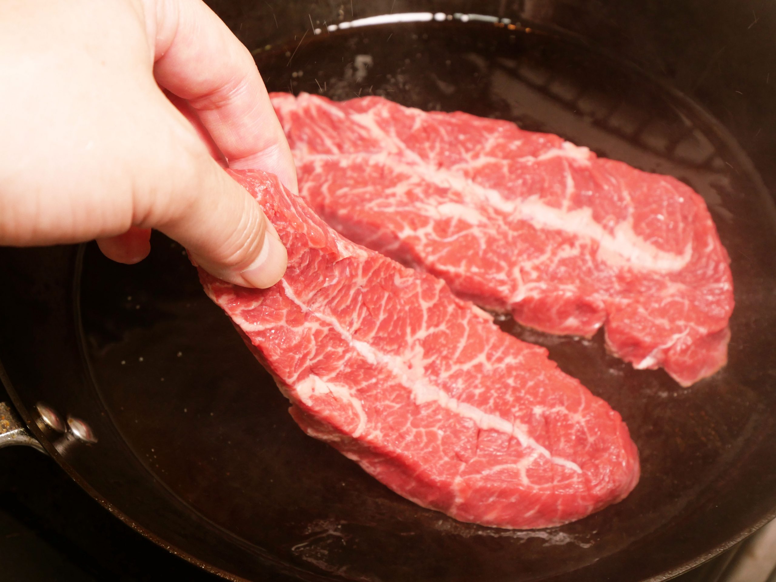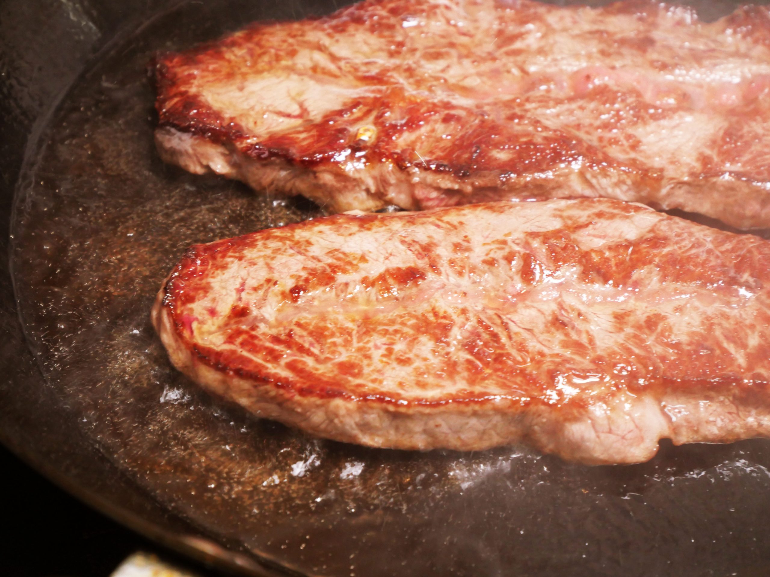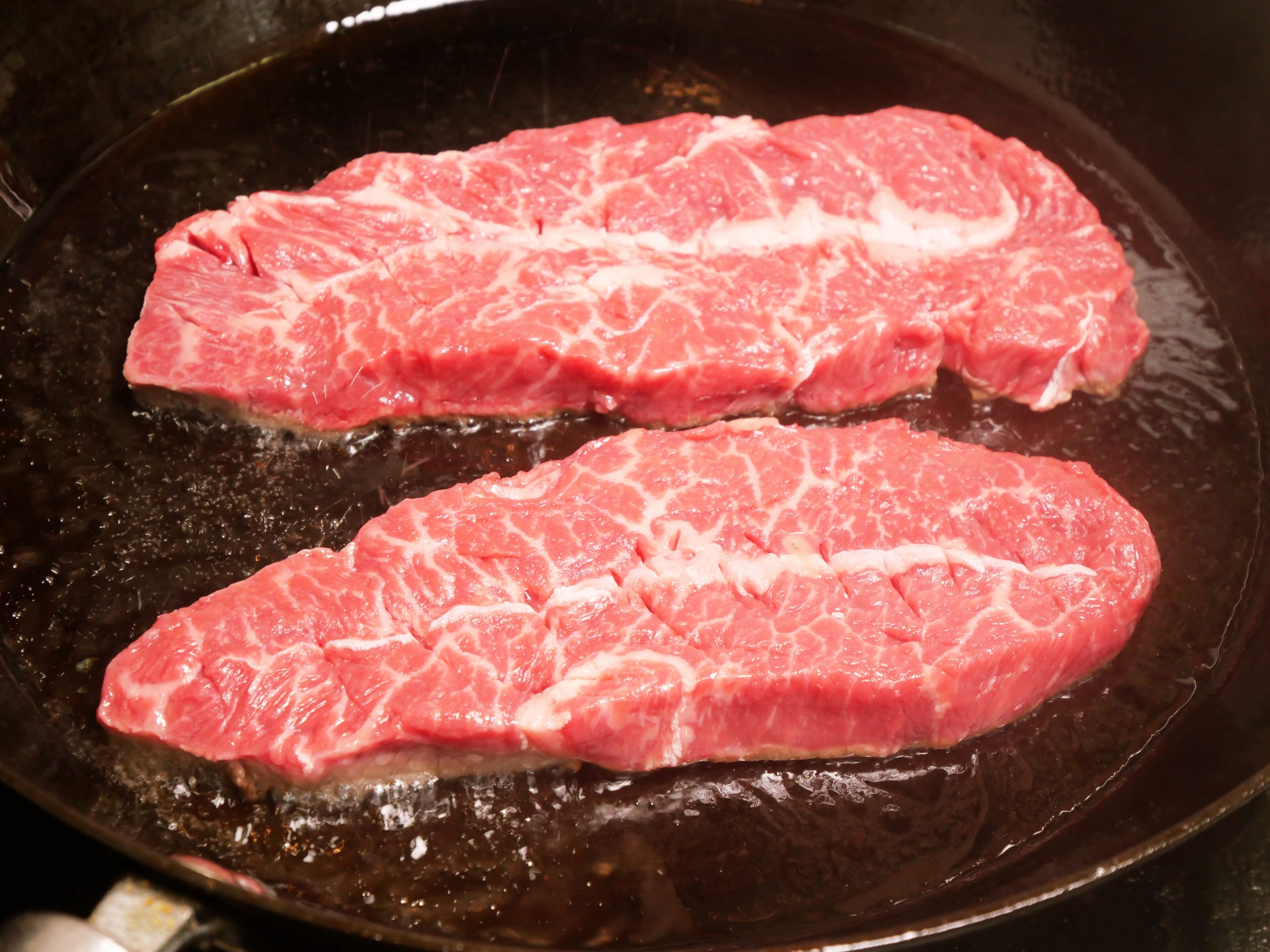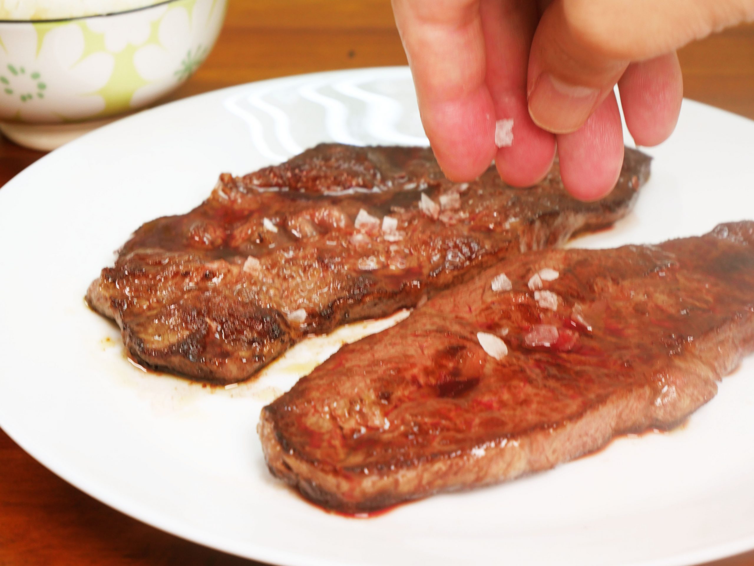 鳥羽シェフの「スーパーマーケットで買ったステーキ肉のおいしい作り方」はとてもカンタンだ。スーパーで買ってきた常温のステーキ肉を用意し、スジに切れ込みを入れる。あとは熱々にしたフライパンに多めの油をひいて強火で一気に焼くだけ。あとは塩をかけて食べるだけである。これが極上だというのだ。
