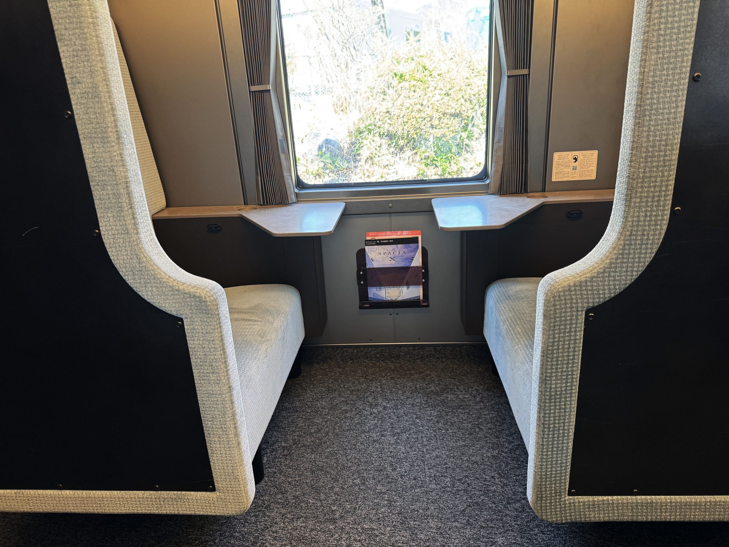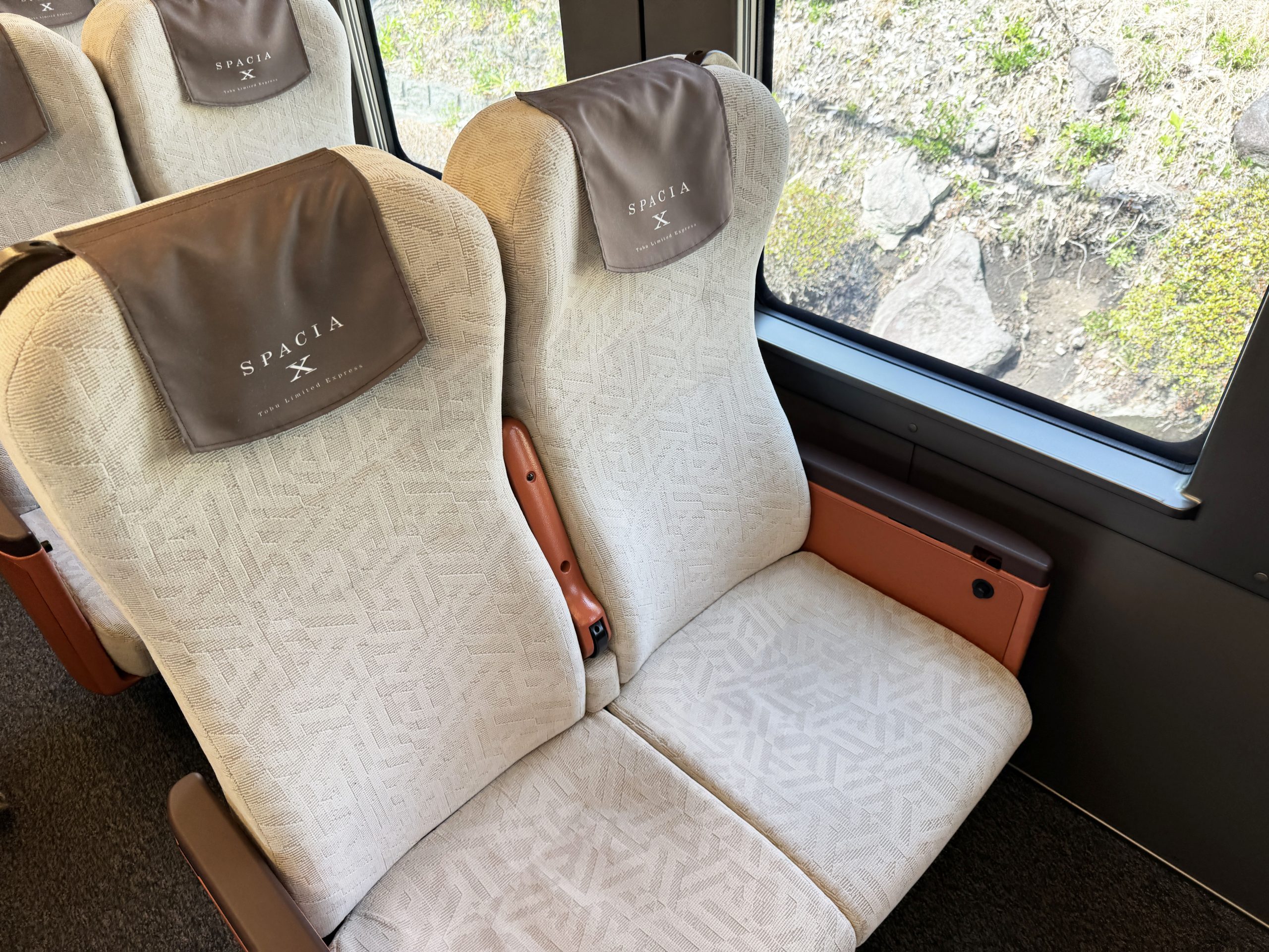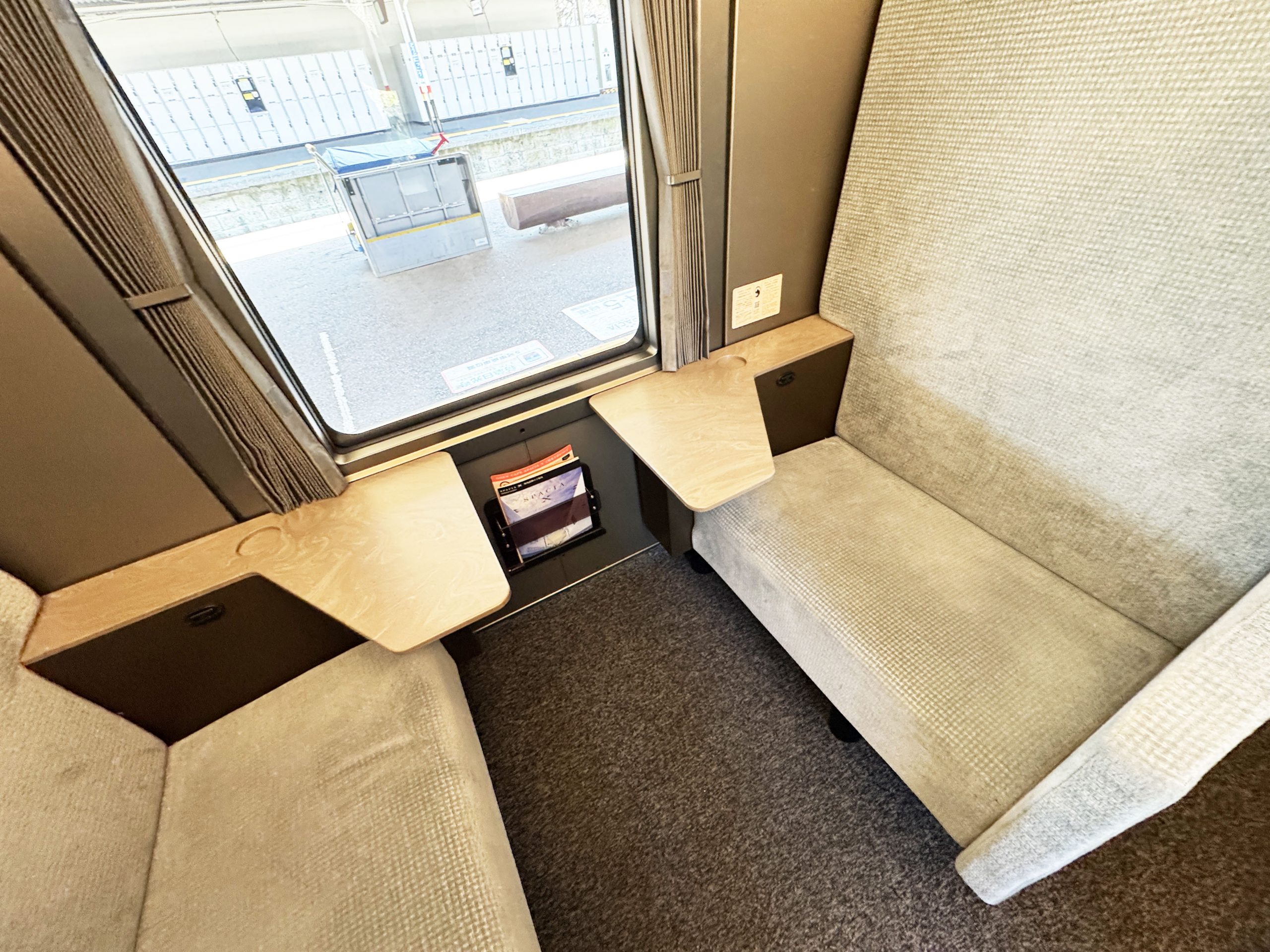 向き合って2人で座れる感じです。東武鉄道によると「横幅約80cmのゆとりあるシート。1つ席に小さなお子様と一緒に座ることも可能です」とのこと。ここで駅弁を食べたり、スペーシアXの限定ビールを飲んだり、いろいろと楽しいと思います。なんか秘密基地っぽさがあってワクワクするのは筆者だけでしょうか。