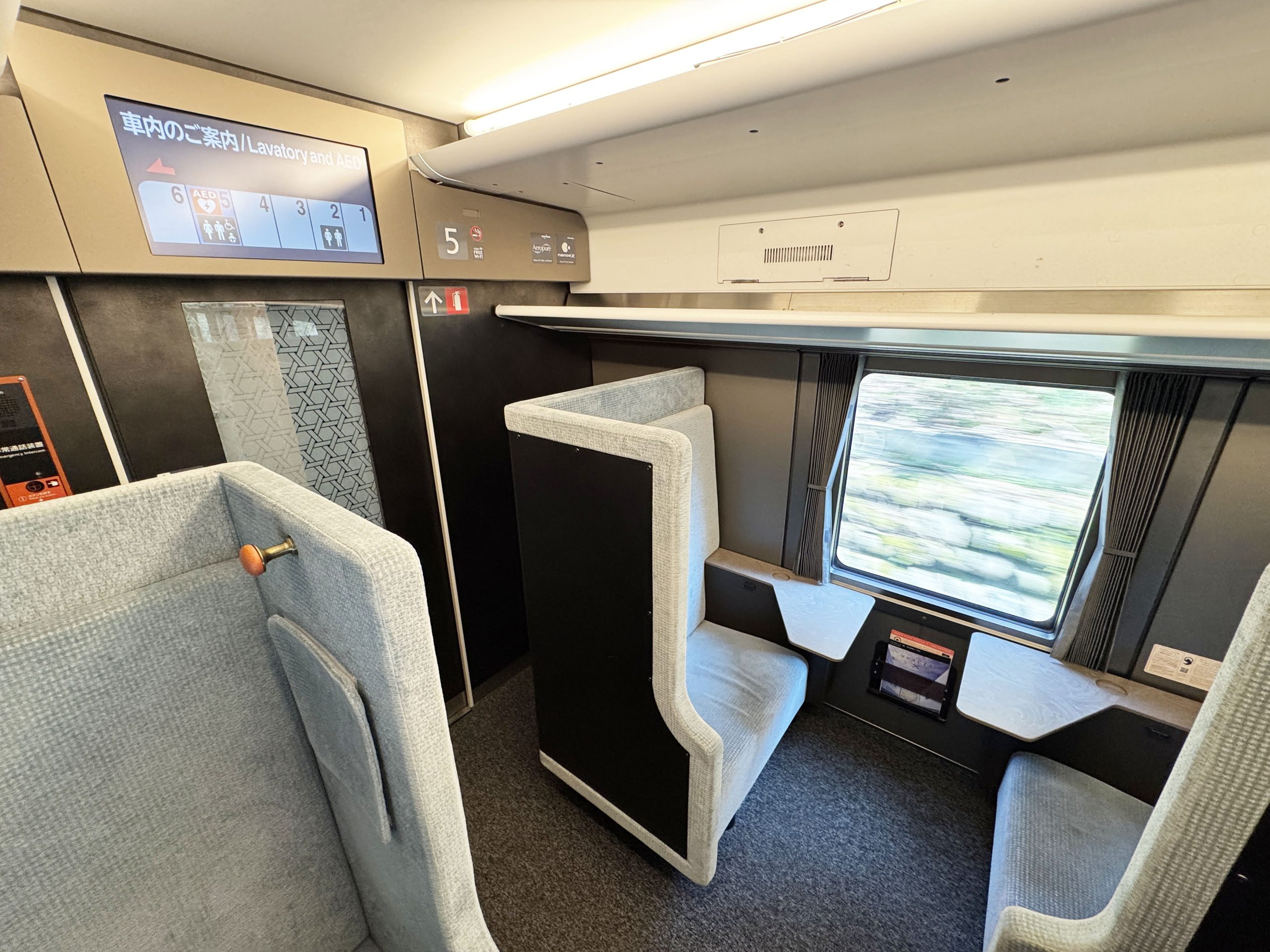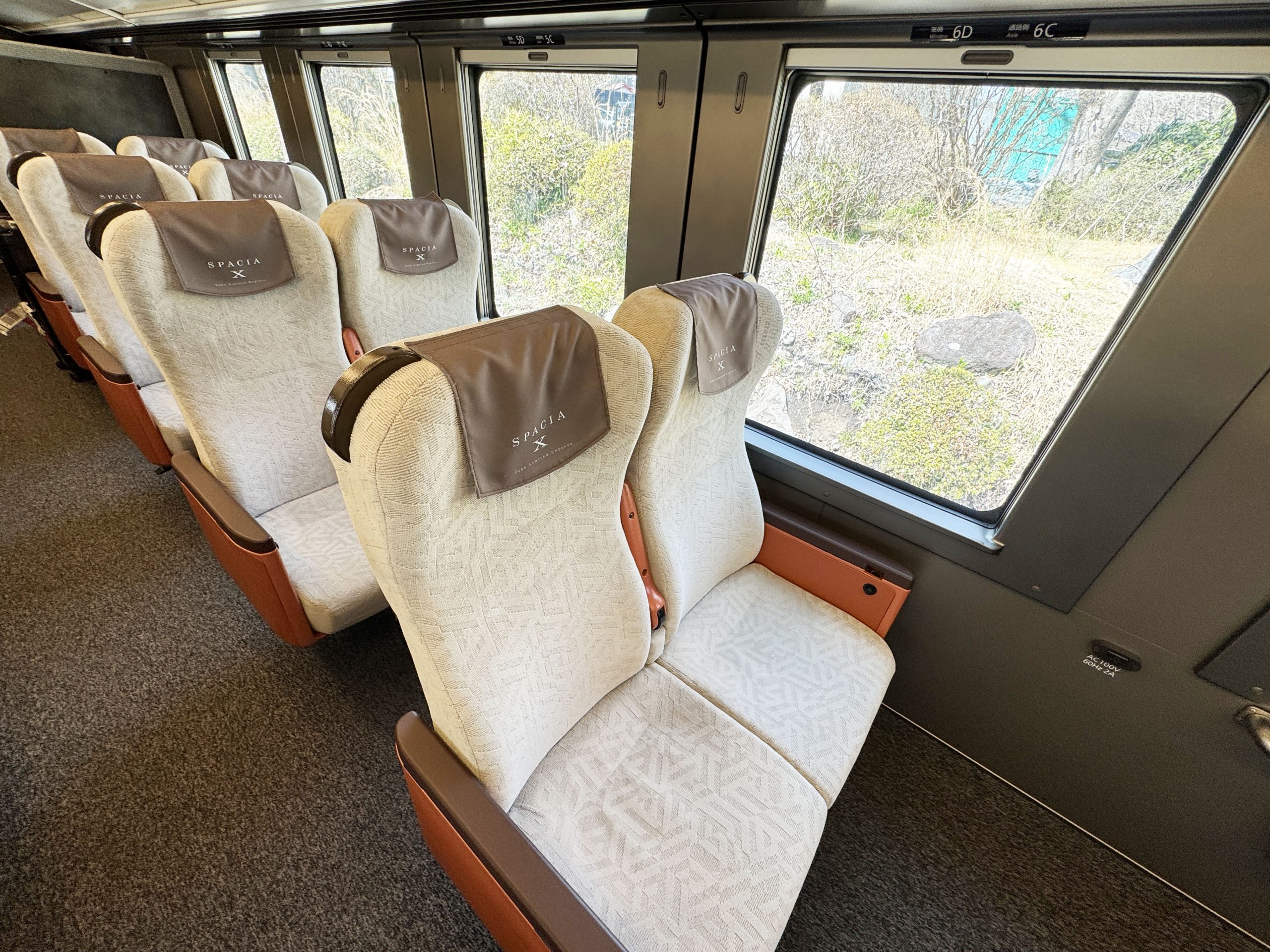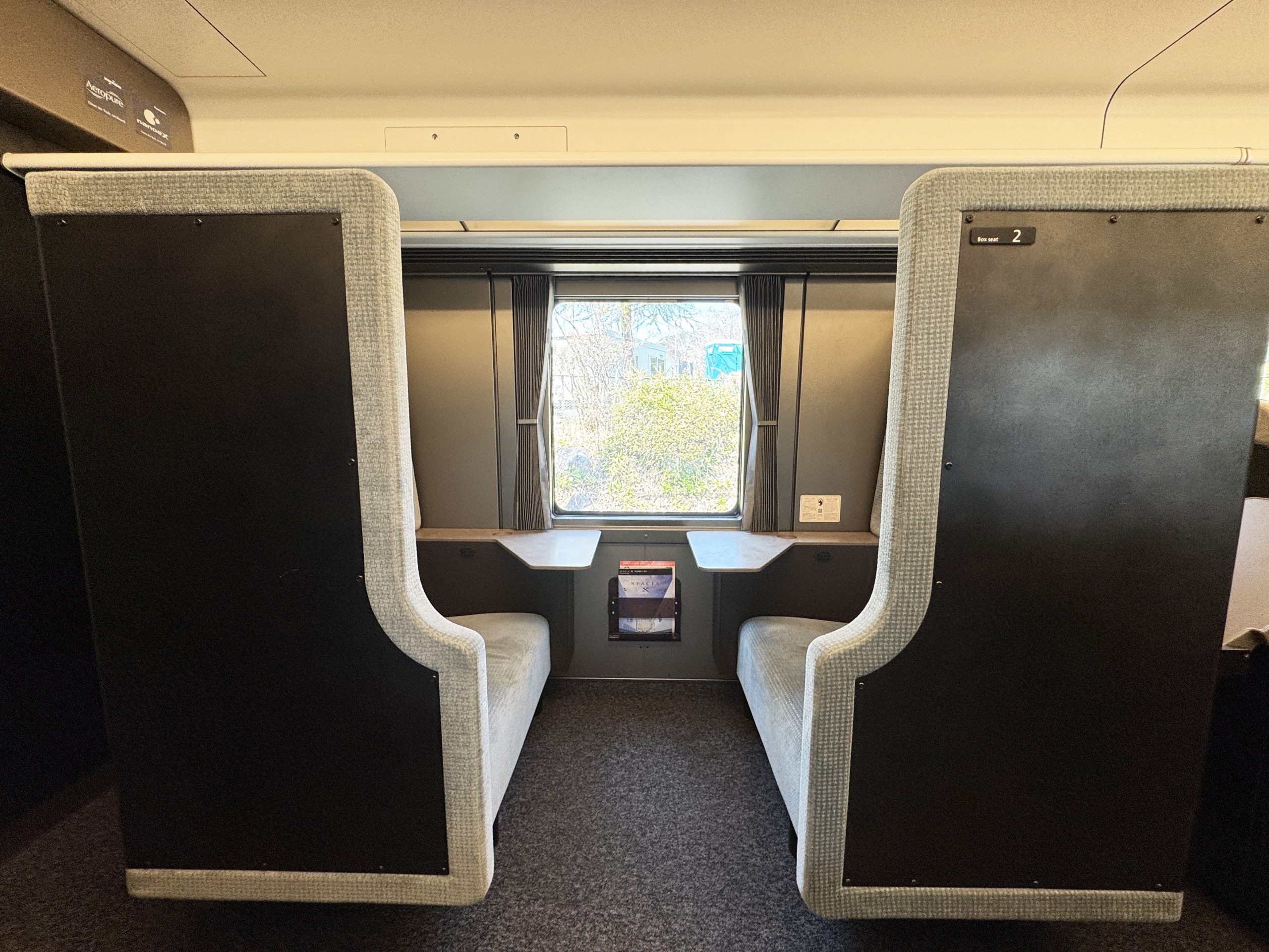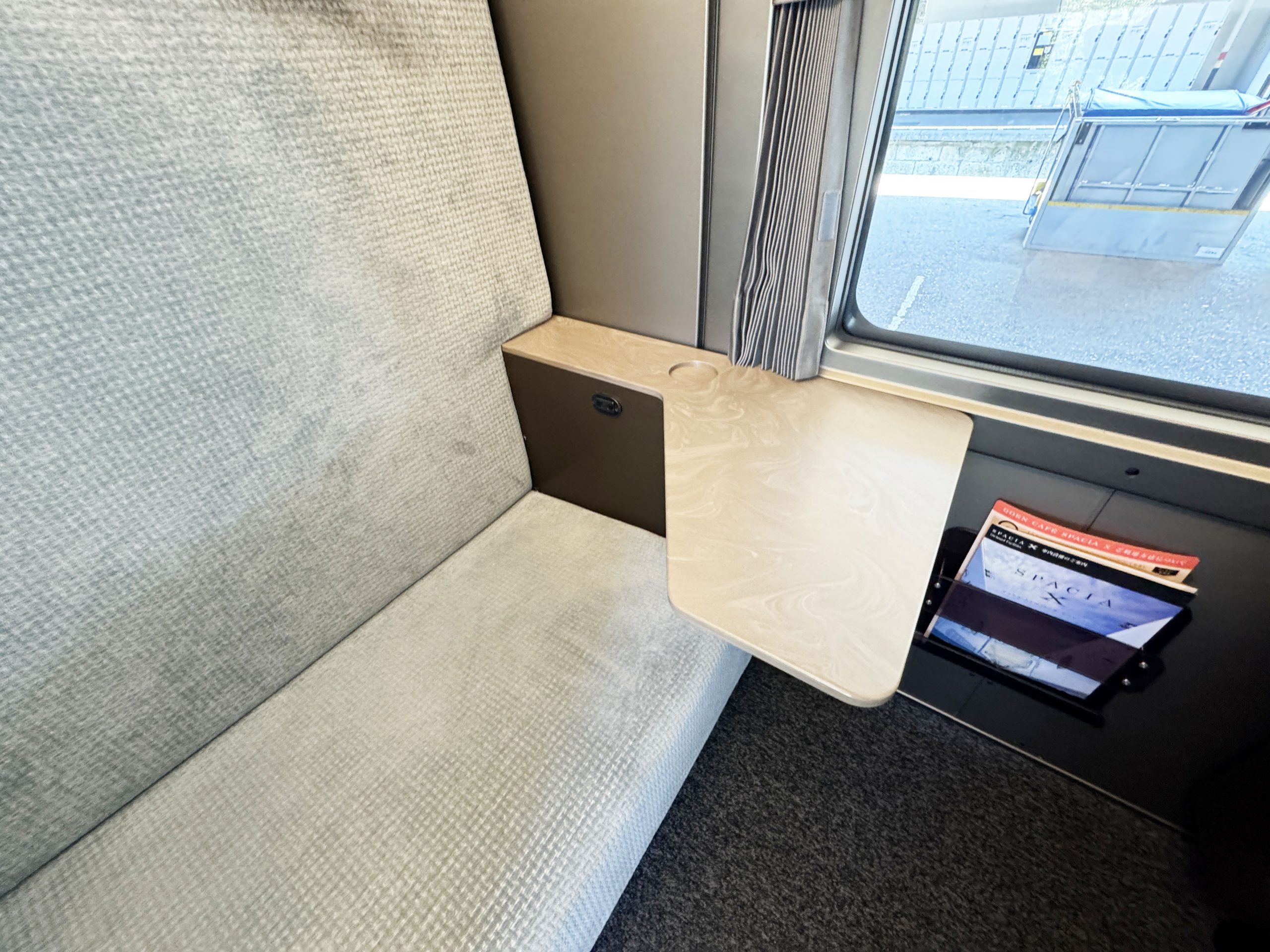向き合って2人で座れる感じです。東武鉄道によると「横幅約80cmのゆとりあるシート。1つ席に小さなお子様と一緒に座ることも可能です」とのこと。ここで駅弁を食べたり、スペーシアXの限定ビールを飲んだり、いろいろと楽しいと思います。なんか秘密基地っぽさがあってワクワクするのは筆者だけでしょうか。
