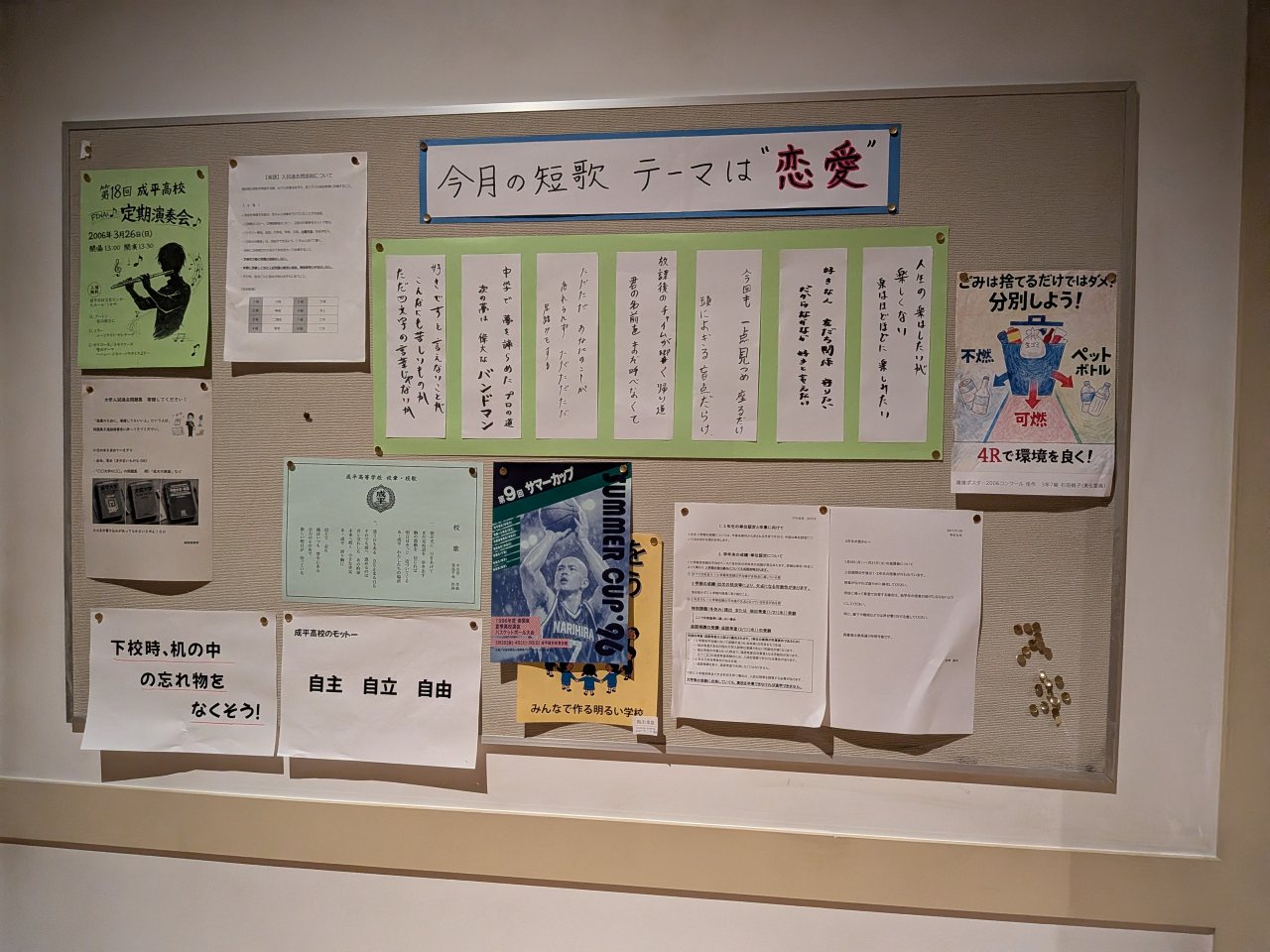 感情移入度を高めるのは没入できる展示のセット。エントランスでしばらく待機したあと、何人かずつ誘導されるのは高校の教室前。廊下には校歌や学校行事のポスター、生徒たちの短歌の作品などが貼られていて、かなりリアルで本当の学校にトリップしたようです。短歌のテーマは恋愛。「放課後のチャイムが響く帰り道 君の名前をまだ呼べなくて」といったエモい短歌を読みながら、脳が次第に恋愛モードになっていきます。この展示、若者の恋愛離れを食い止める効果もあるかもしれません。