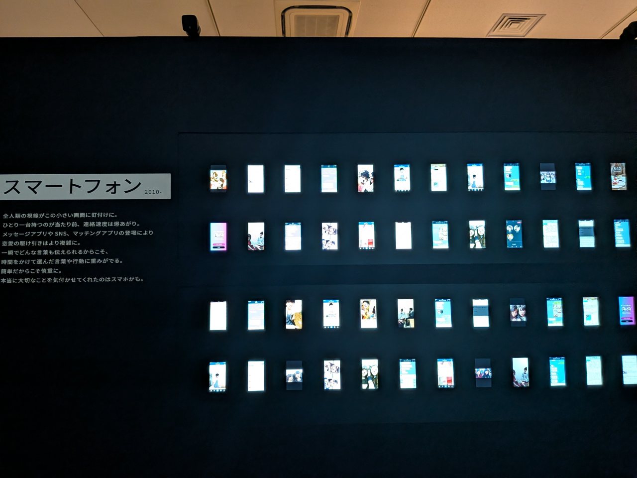 それにしても「平成後期」コーナーはスマホの画面だらけで画一的です。公衆電話や交換日記、ポケベルに手紙交換など、平成初期と中期のほうが、アナログの魅力もあり、コミュニケーションの歴史を肌で感じることができました。歳を重ねてきて良かったかもしれないと思えてきます。なぜか恋愛の思い出より、通信手段の変化の方が鮮烈に記憶に残っています……。今後の「令和恋愛」は、もしかしたらAIとの恋愛も入ってきそうです。