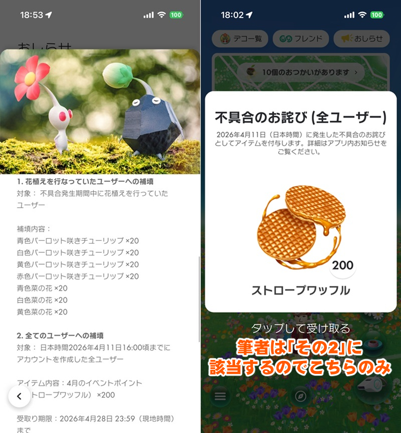 プレイログ第1122回目の今回は、先週末のコミュニティ・デイ初日に発生した通信障害の補填が「花植えをしていたかの有無」に応じて違っている点をおさらい。