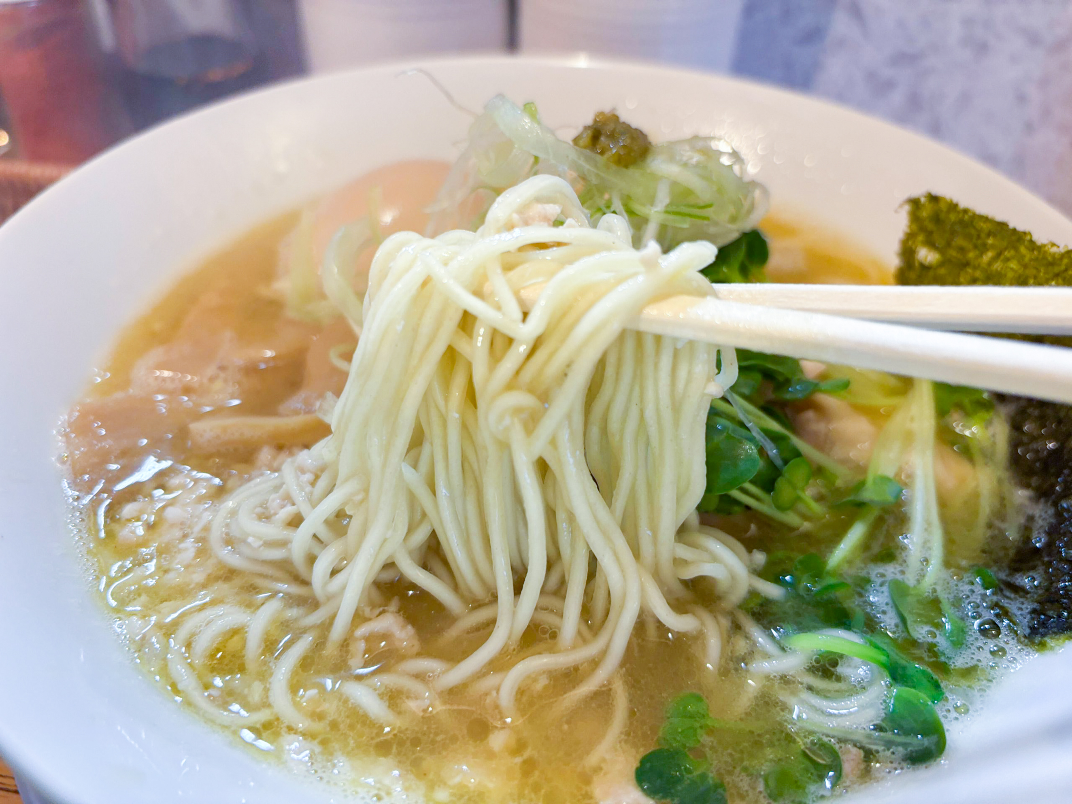 さらにこの一杯の真骨頂は、食べ進めるごとに変化していく表情の豊かさにある。鶏そぼろの部分を食べれば旨味の層が厚みを増し、白髪ネギとカイワレという薬味類の多彩さも抜かりなく、柚子胡椒を絡めれば一気に爽やかさが立ち上がる。どの要素を取っても高水準でありながら、それぞれが主張しすぎず、あくまで一杯としての完成度に寄与しているのが見事だ。