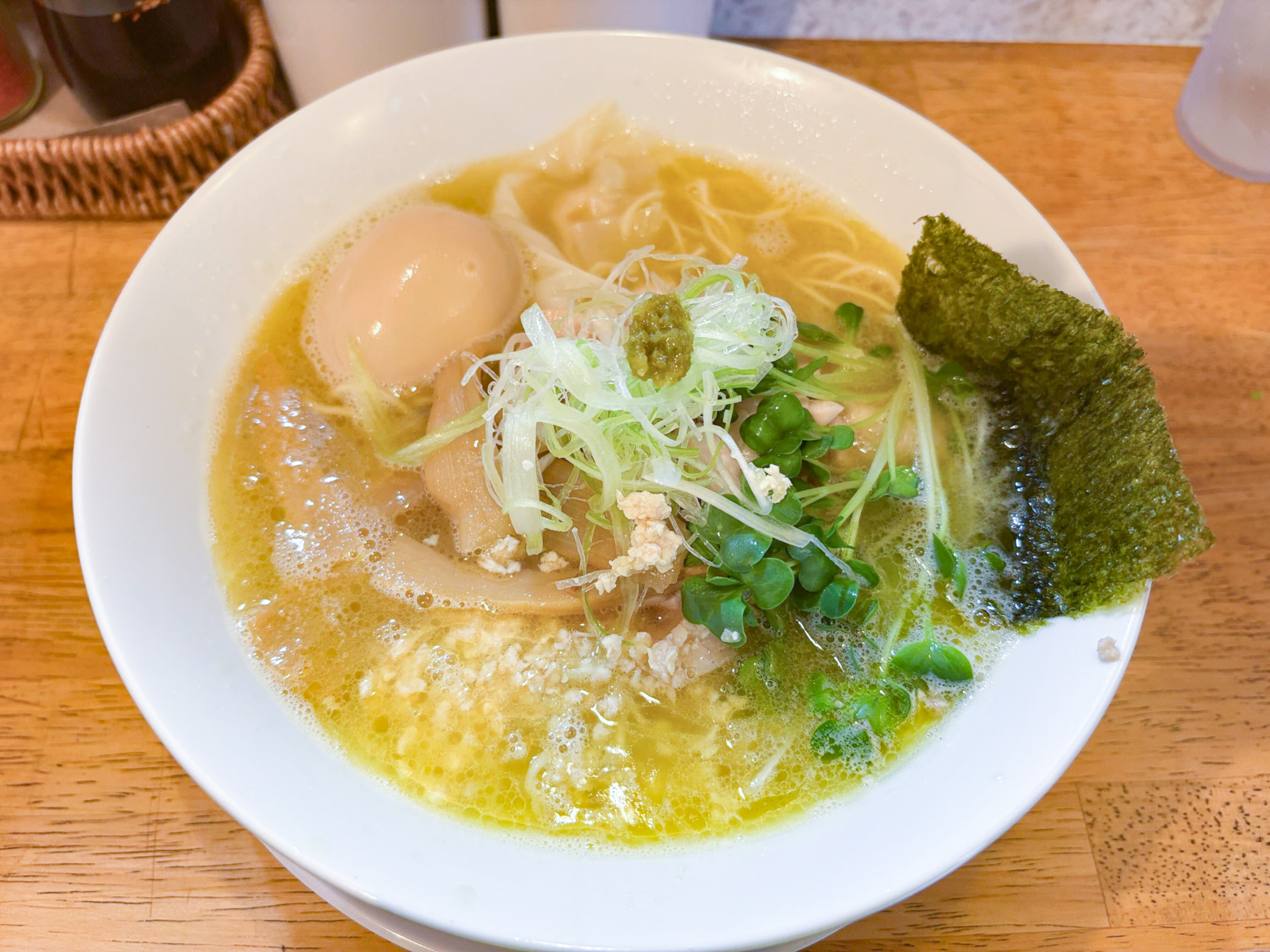 「特製とりそば」を注文。具は鶏チャーシュー、鶏そぼろ、味玉、ワンタン、メンマ、白髪ネギ、カイワレ、ノリと、実に多彩な具材が美しく配置されている。白髪ネギの上には柚子胡椒が添えられている。