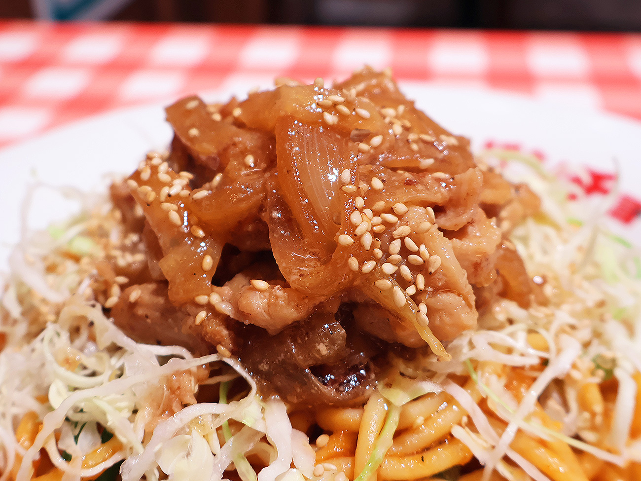 というわけで、早速「スタミナ生姜焼きナポ」の大盛(1,290円)を食べてみたんだけど、麺は当然すごいが生姜焼きの盛りっぷりもすごい!