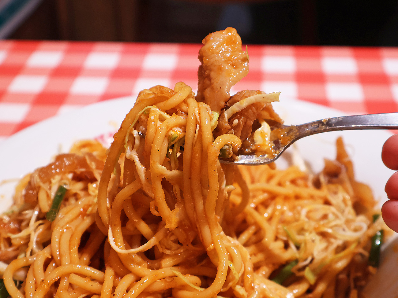 食べたあとにそう思ってしまう一抹の不安が残りながらも、後先は考えず豪快に混ぜ混ぜ。麺量が多いので混ぜるのも大変。フォークじゃなくて割り箸だったらバキッと折れちゃいそうな重量感。