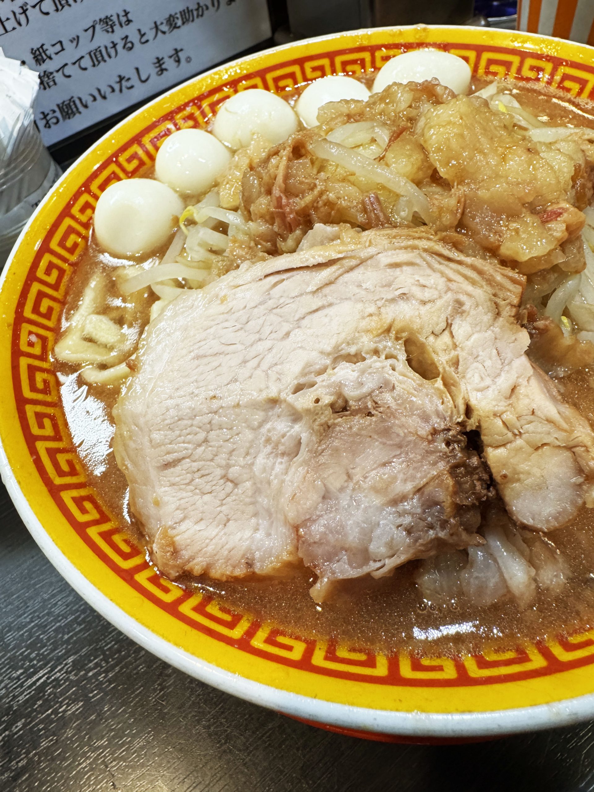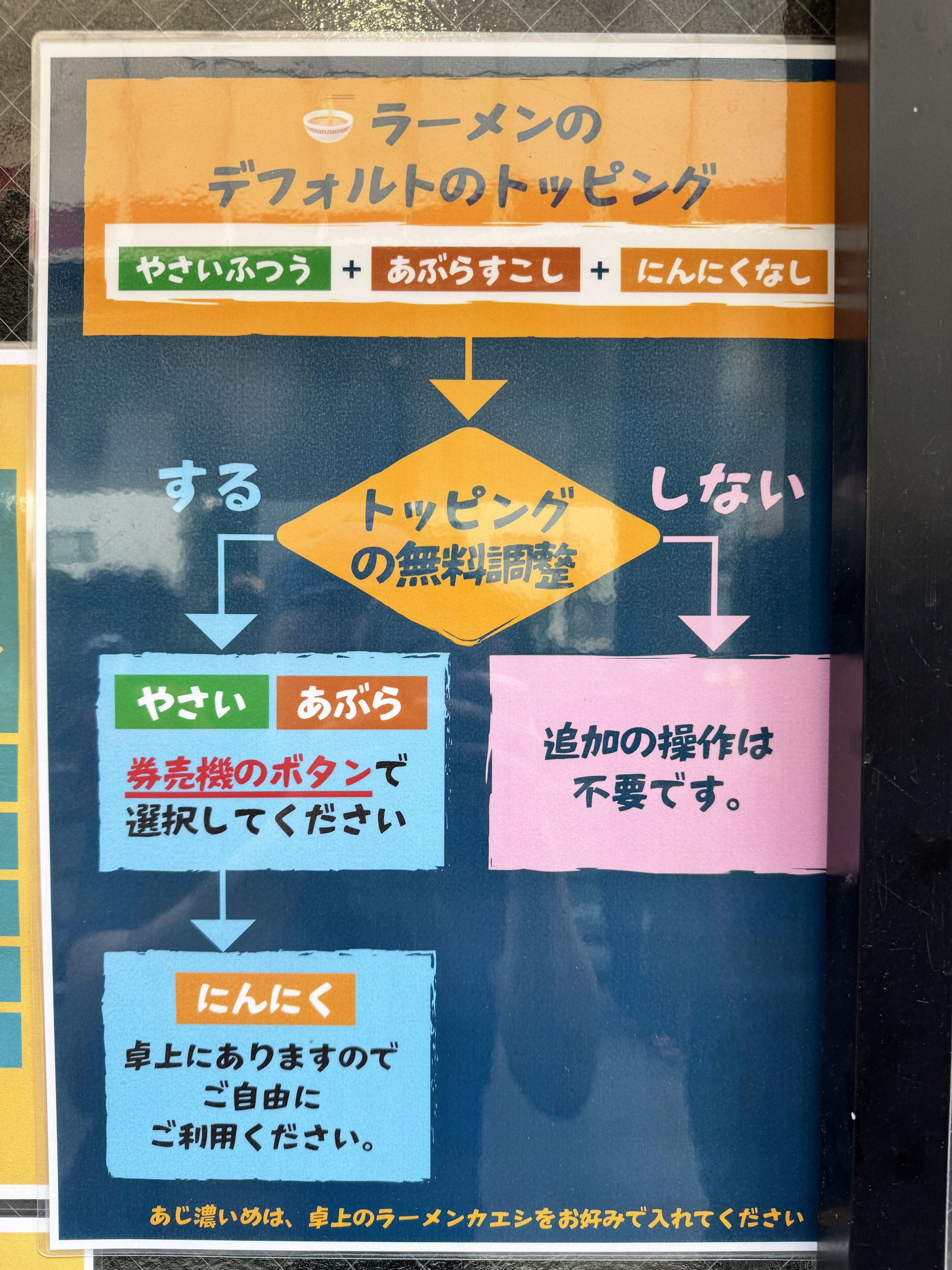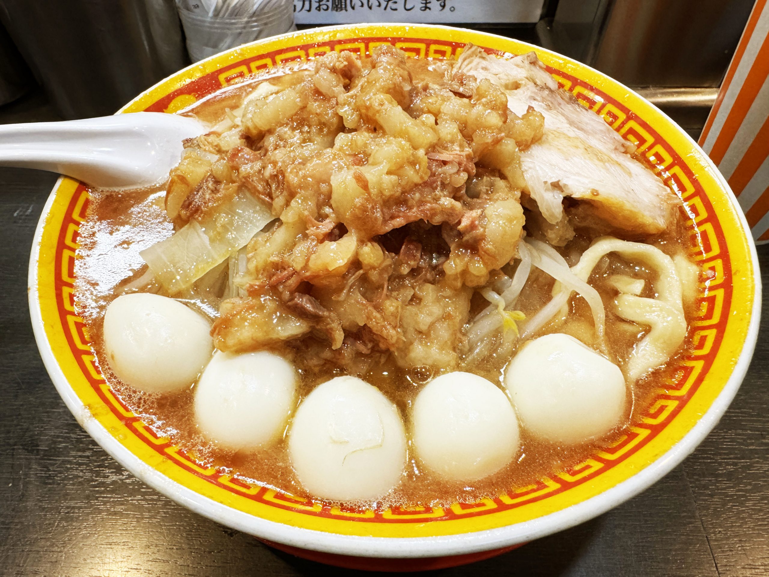 ここ、二郎系ラーメンの初心者にもやさしい店舗。ルールも手順も店舗に掲示されているので、並んでいるだけでいろいろ理解できる。