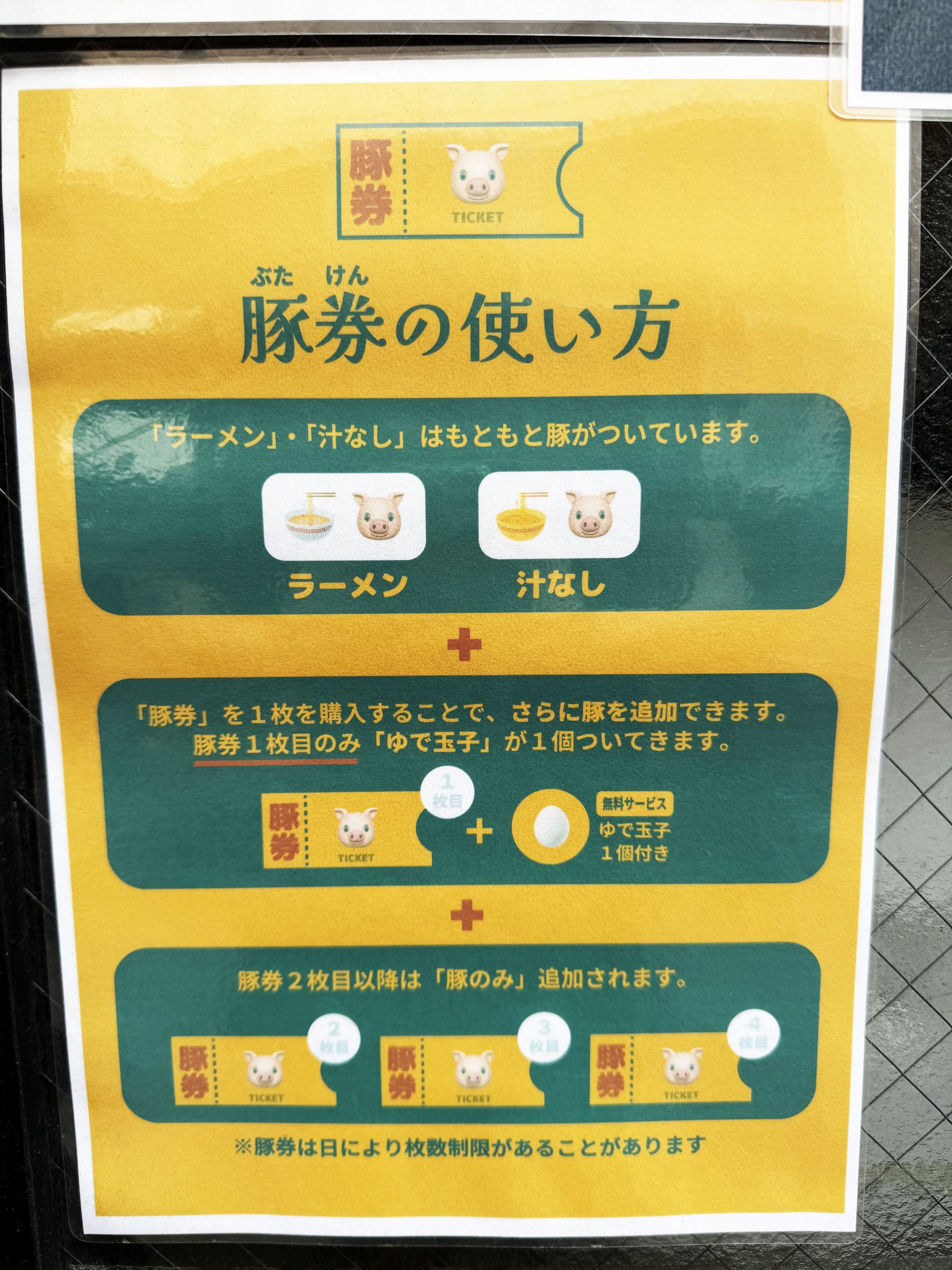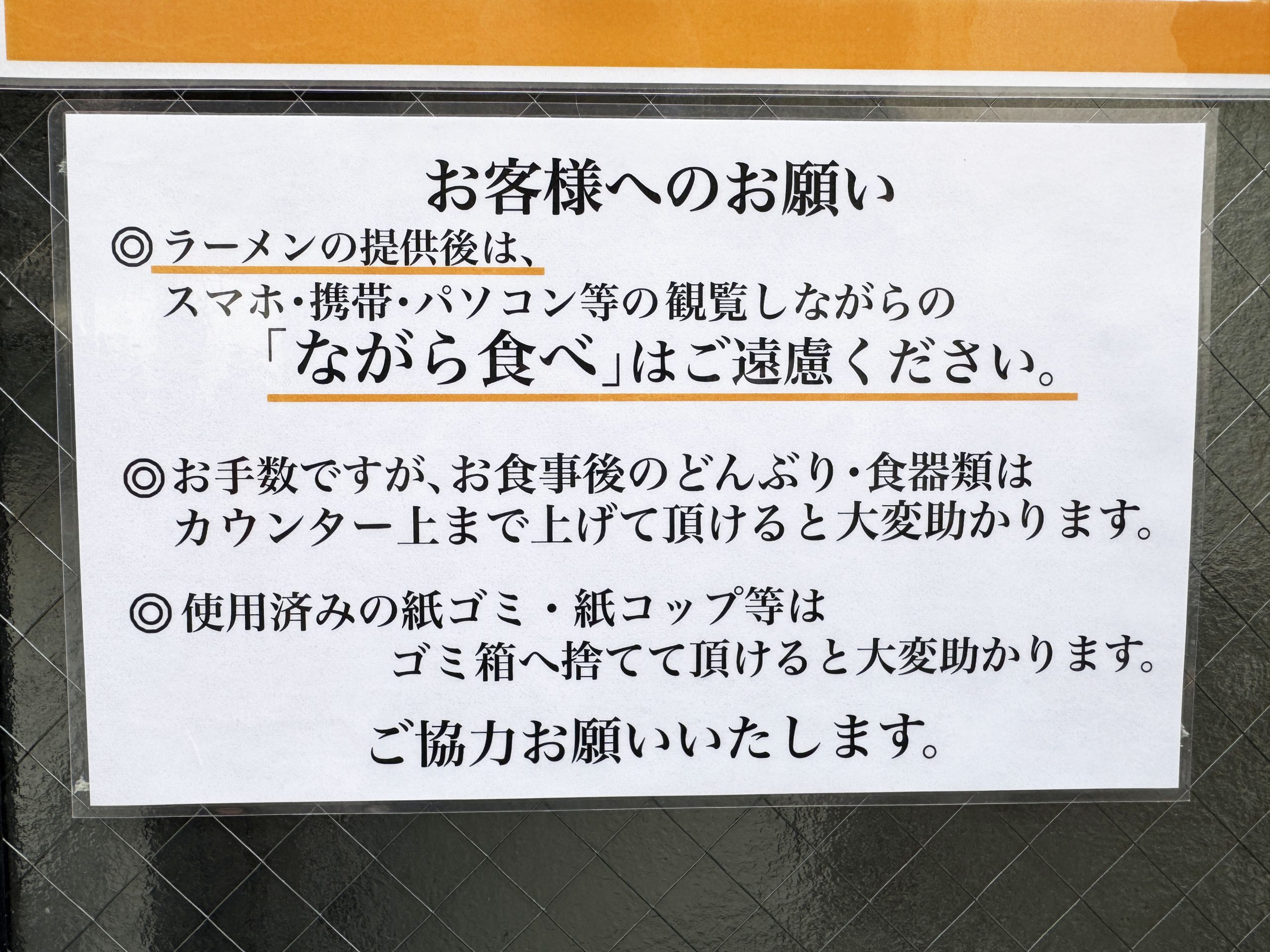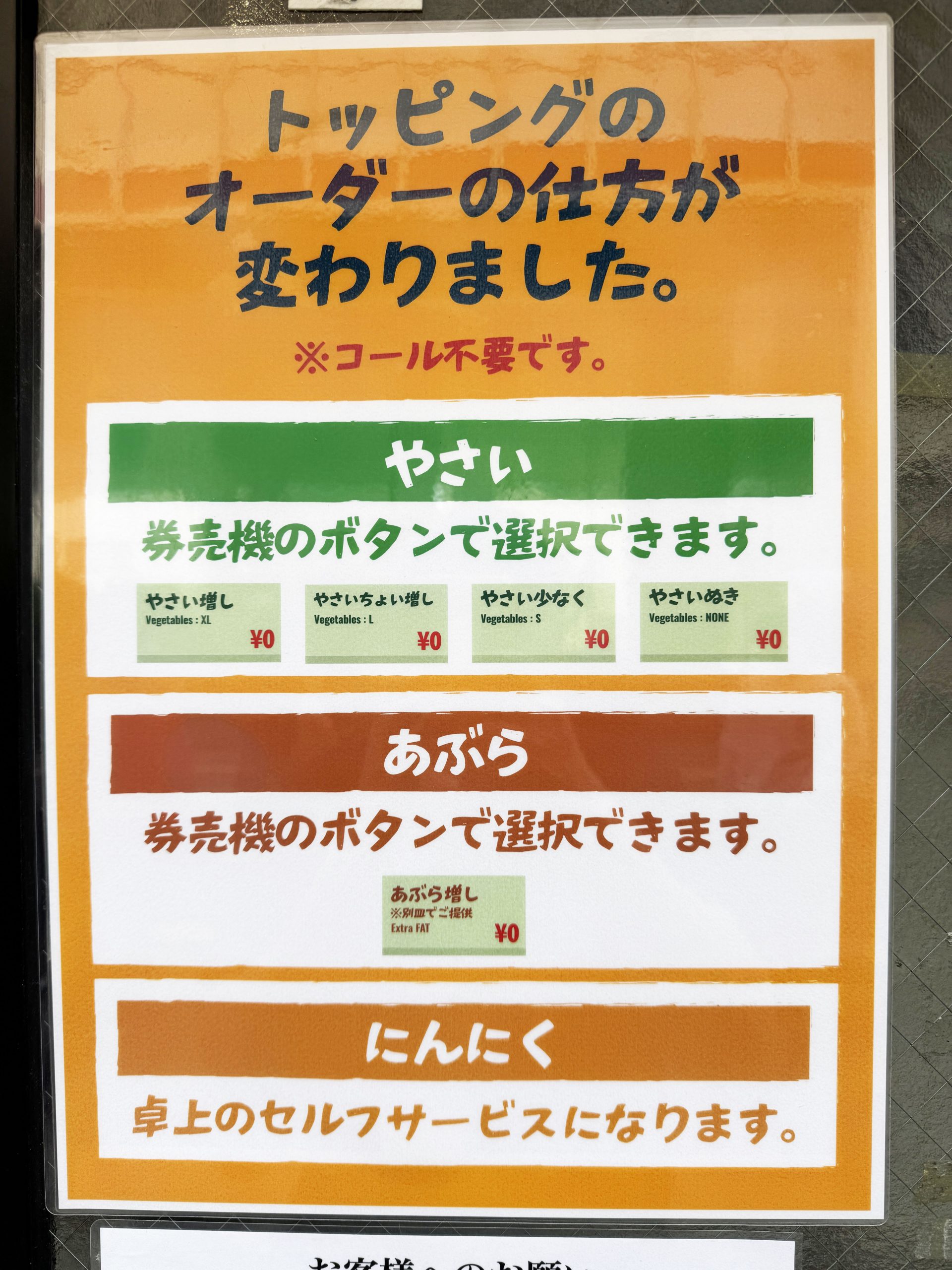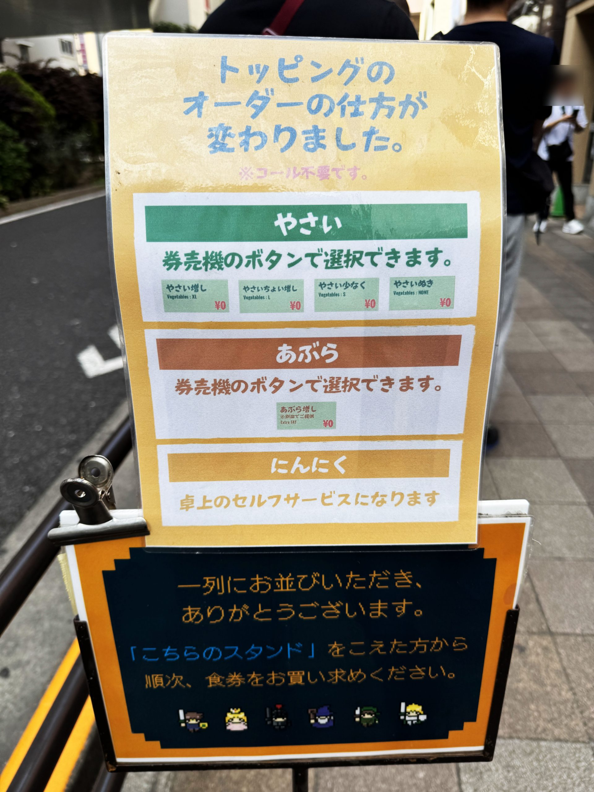 ここ、二郎系ラーメンの初心者にもやさしい店舗。ルールも手順も店舗に掲示されているので、並んでいるだけでいろいろ理解できる。