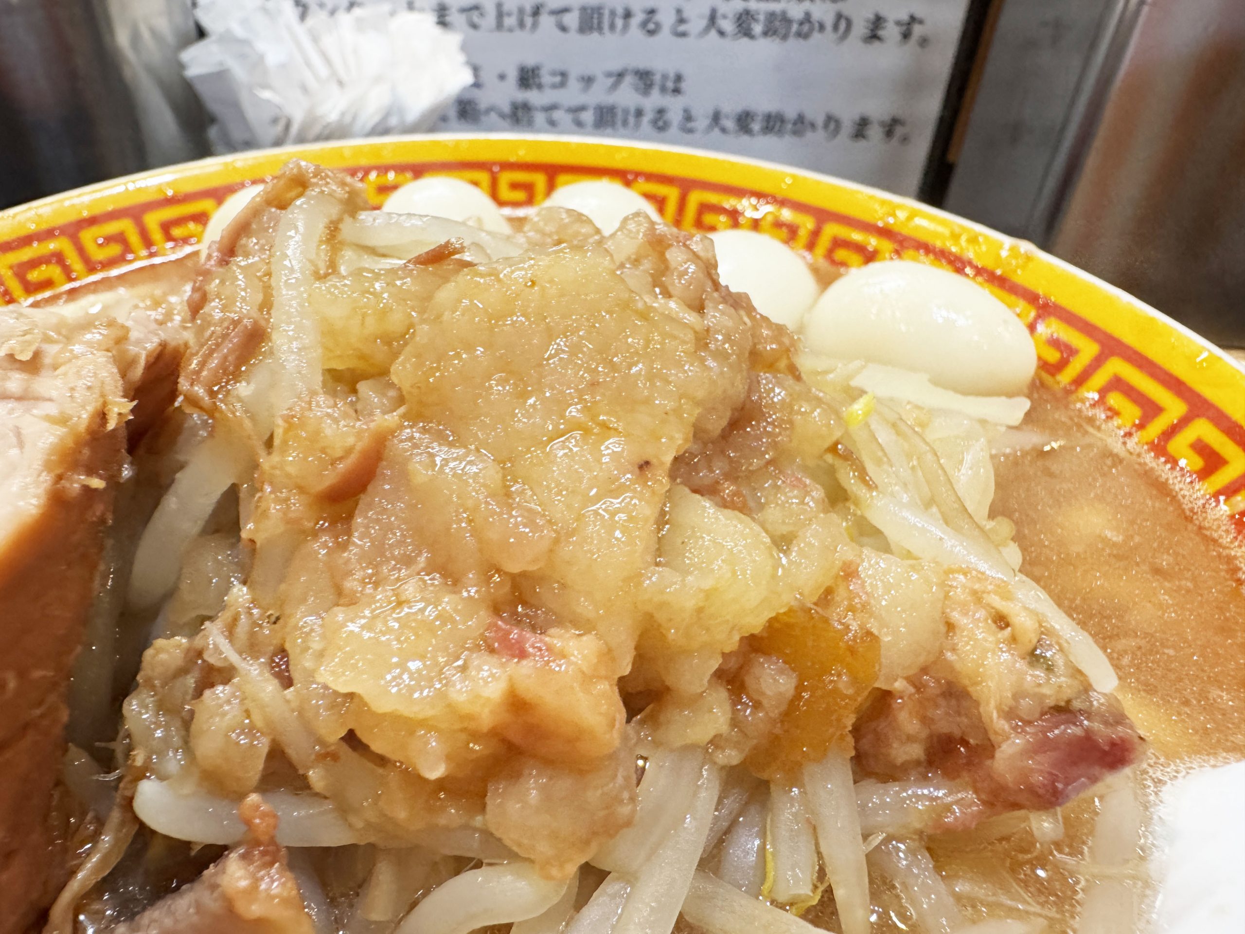 えどもんどの素晴らしい点は、ニンニクかけ放題な点。世にある二郎系ラーメン店は、ニンニクマシマシにしても、さほどニンニクが増えないケースが多々ある。