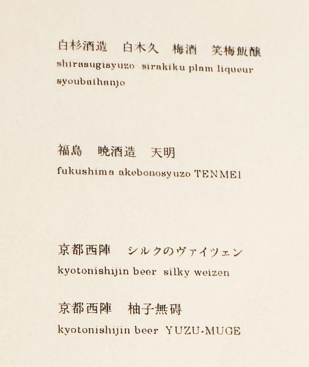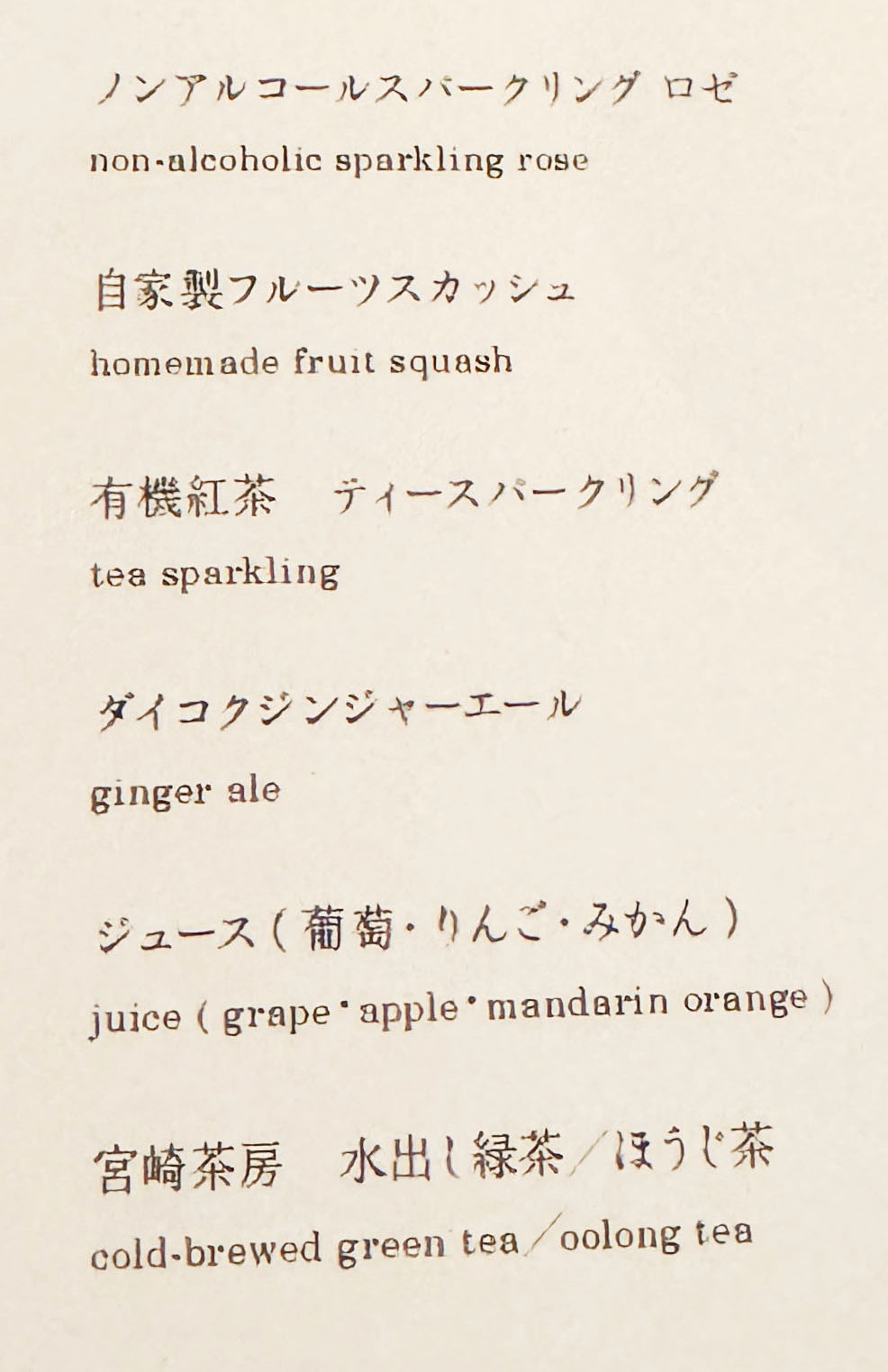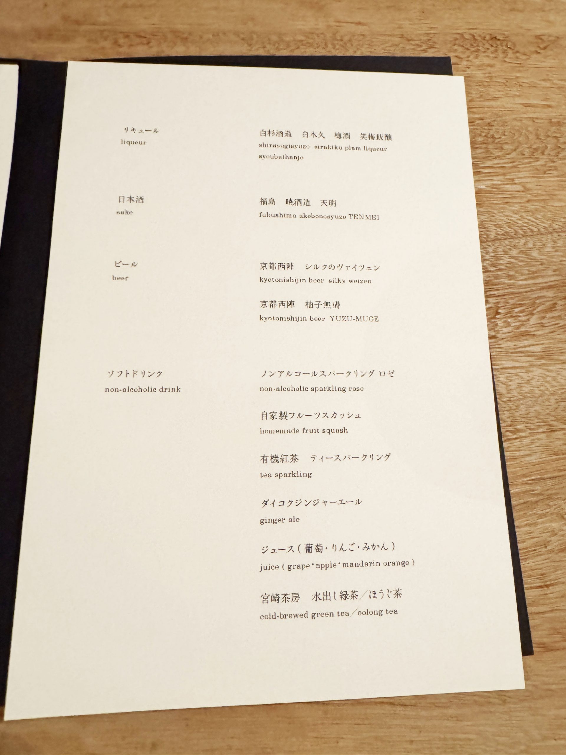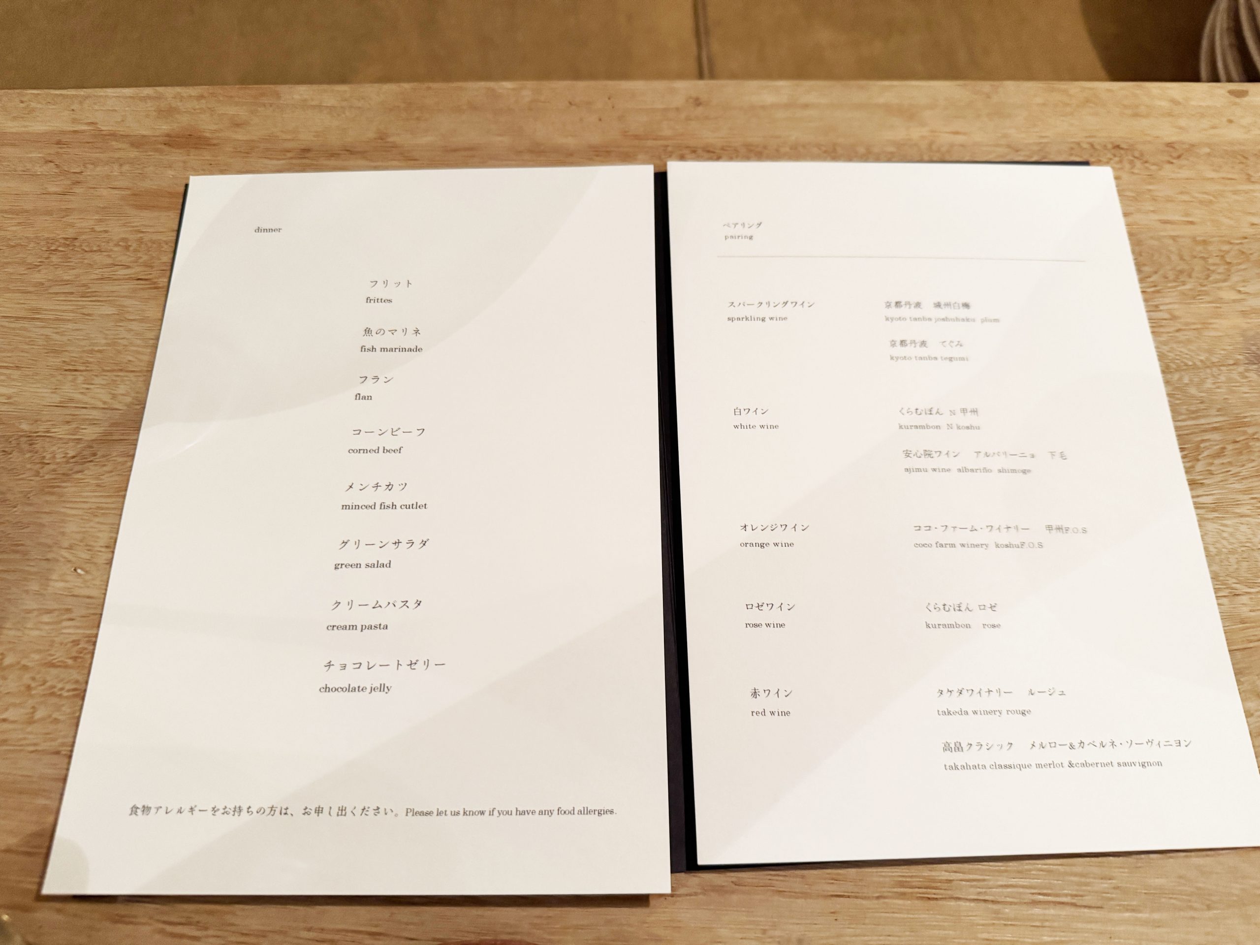 料理はコースになっていて、それぞれの料理にペアリングとなるお酒やソフトドリンクがあります。自分が好きな飲み物を飲むことも可能でした。メニューを見ただけでワクワクしてきます。だってここは、任天堂レストランともいえる聖地。そこで極上のコースが始まるのです。