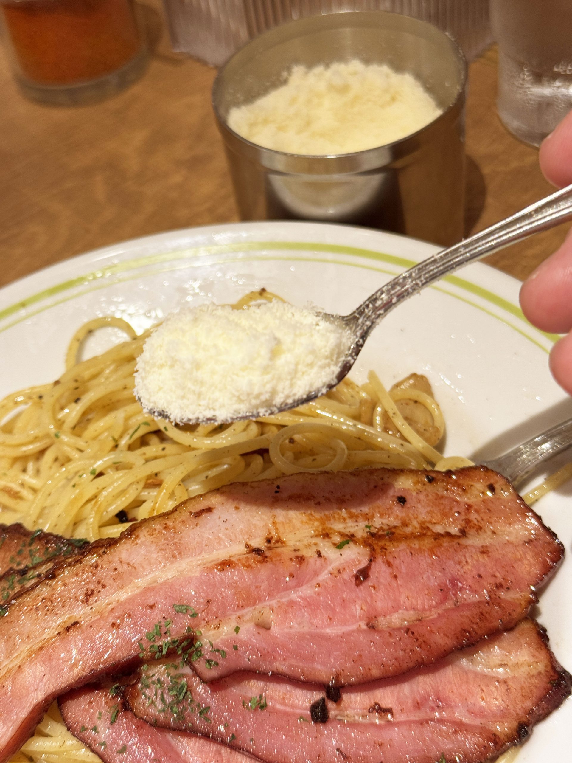 あるでん亭のパスタはカラッとクリスピーに仕上げられているせいか、粉チーズとの相性バツグン。