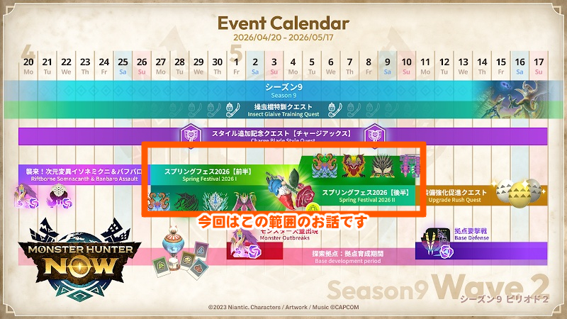 その中でも期間が長く、前後半の2部構成であることがかねてより告知されてきた「モンハンNowスプリングフェス2026」の詳細がついに公開された。