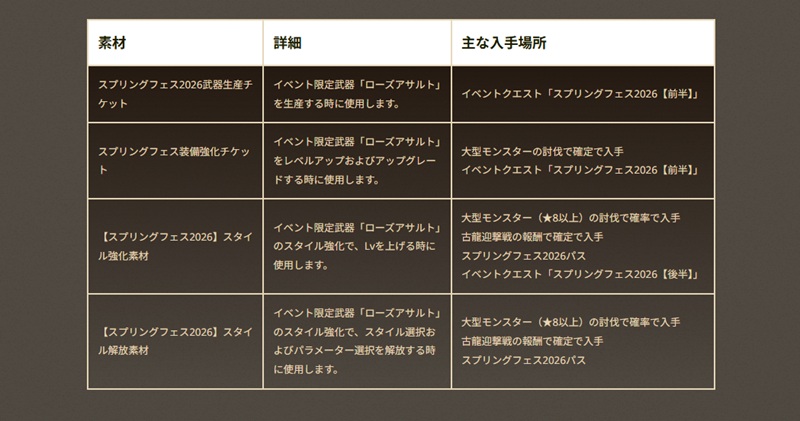 また、星8以上の大型モンスターや古龍迎撃戦ではスタイル強化に必要な「【スプリングフェス2026】スタイル強化素材」、「【スプリングフェス2026】スタイル解放素材」も獲得可能。