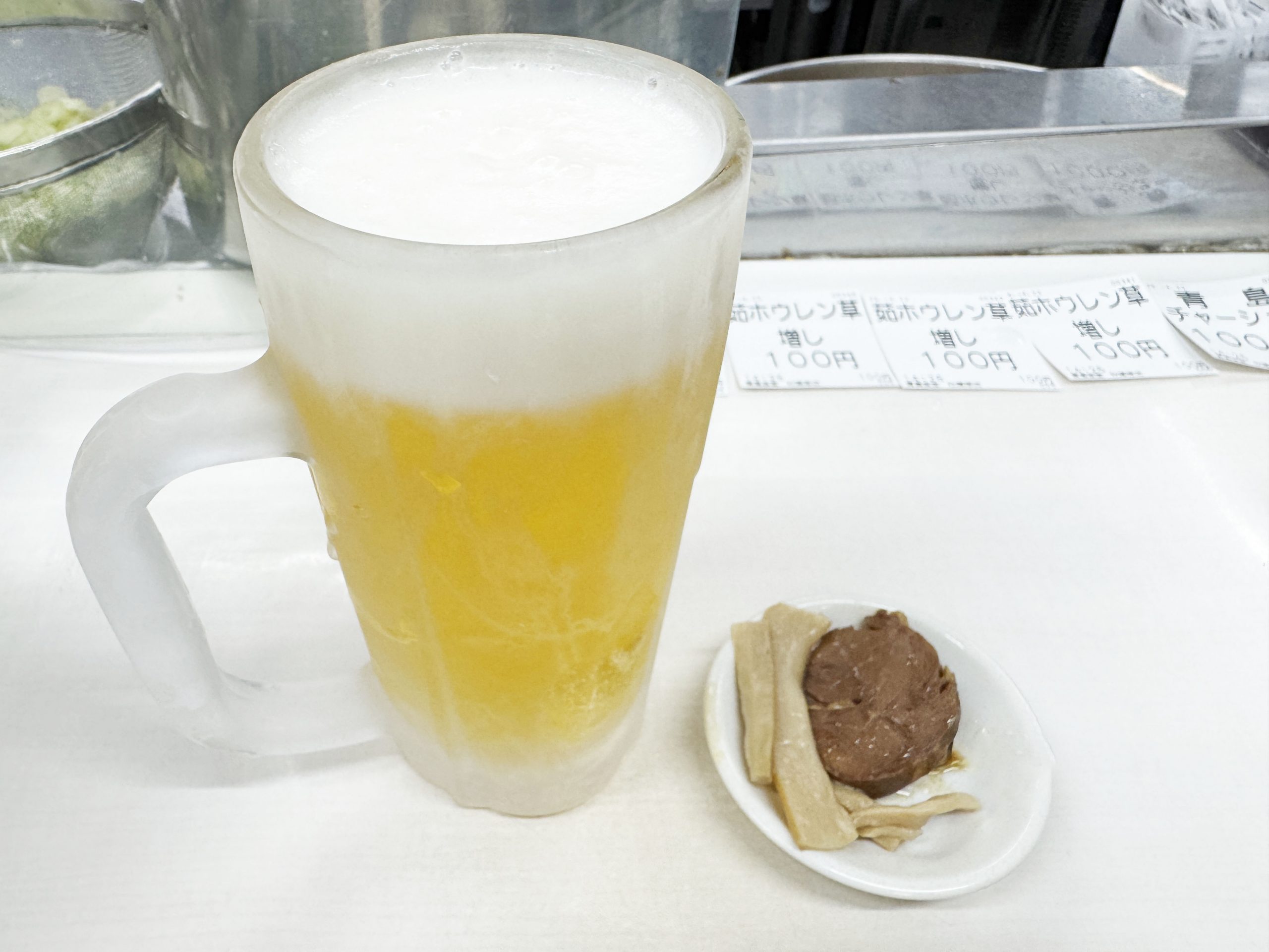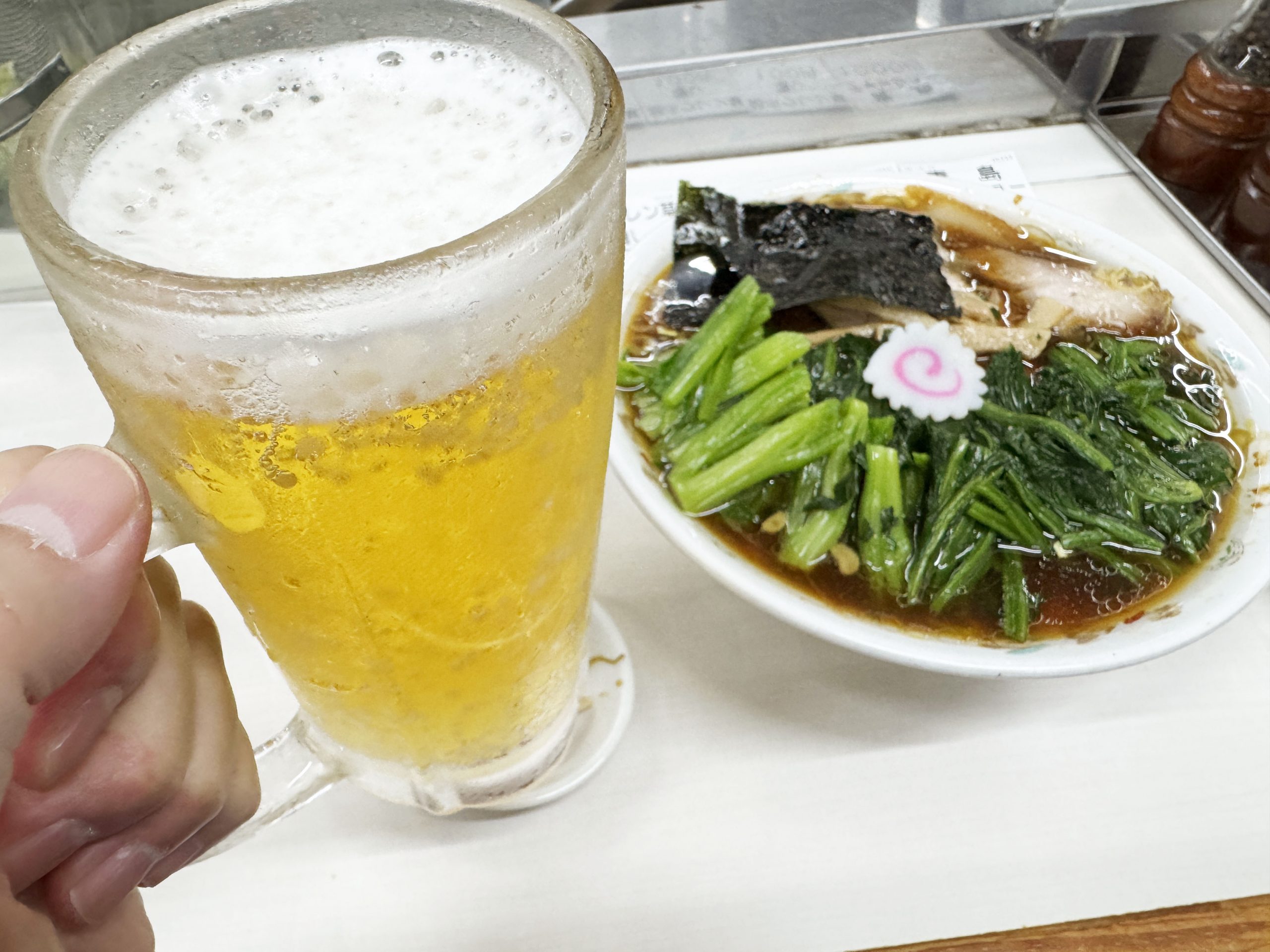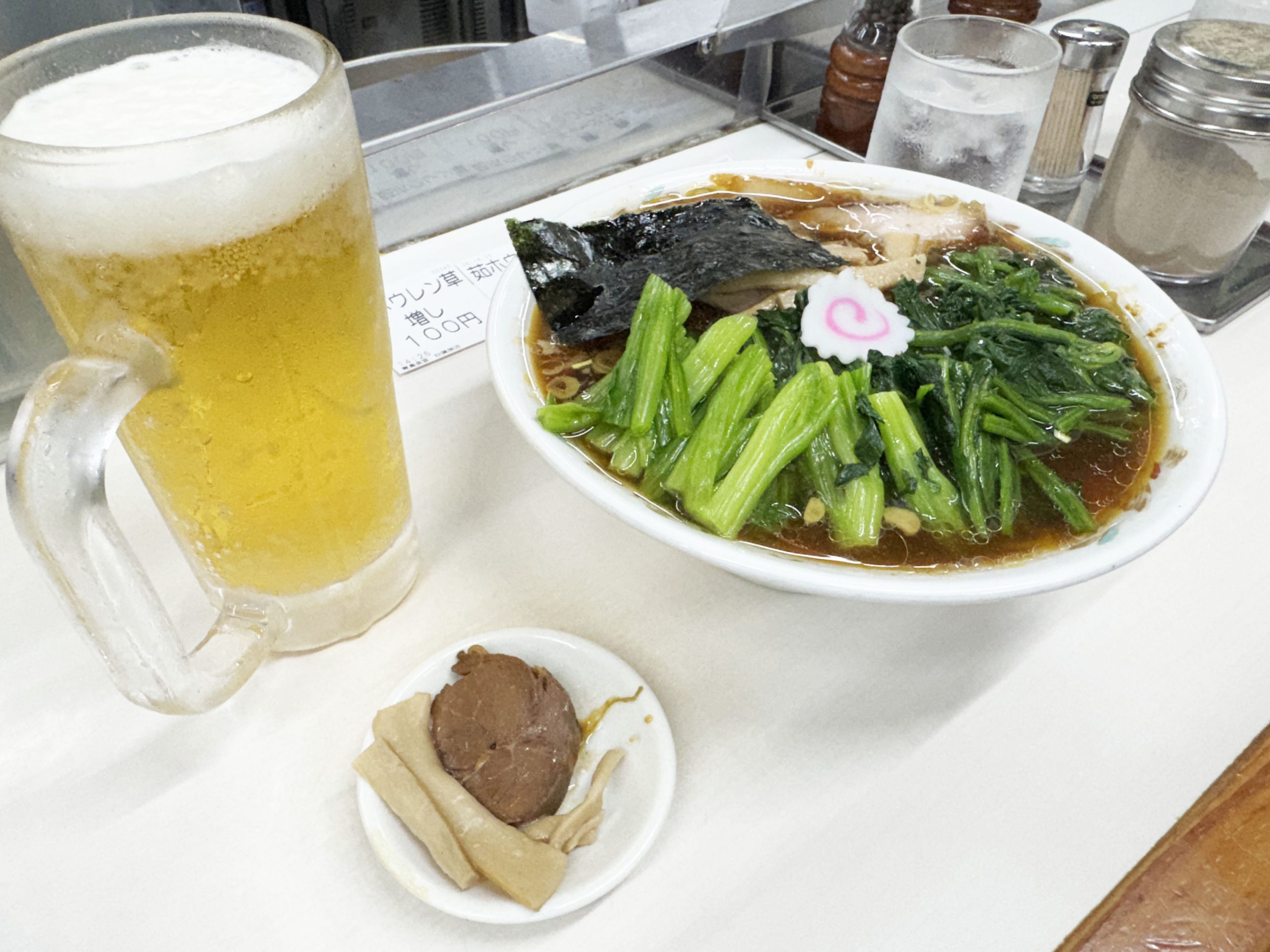 キレのあるビールと、温かく醤油感が強いスープの緩急が味覚を楽しませてくれるのだ。