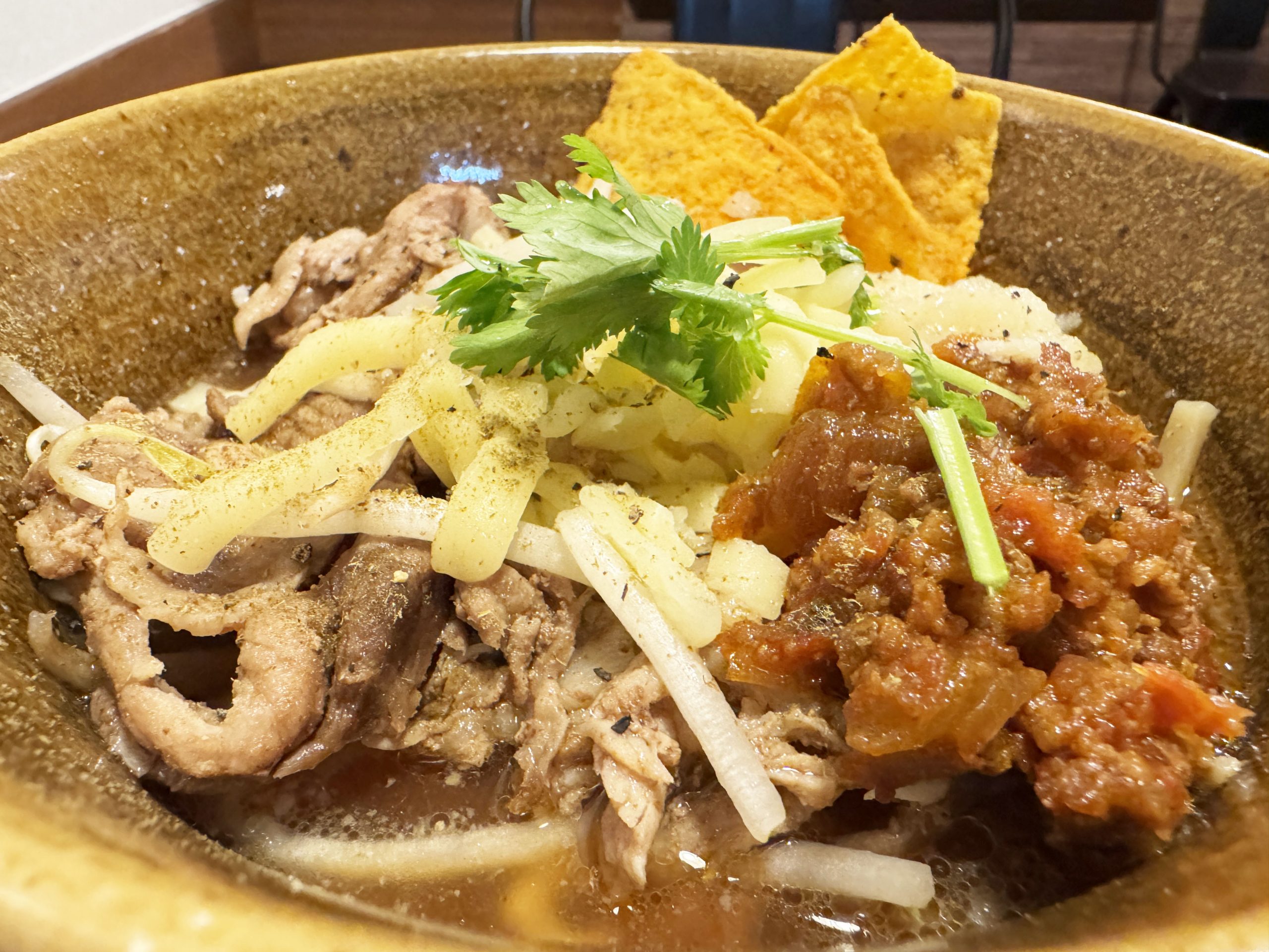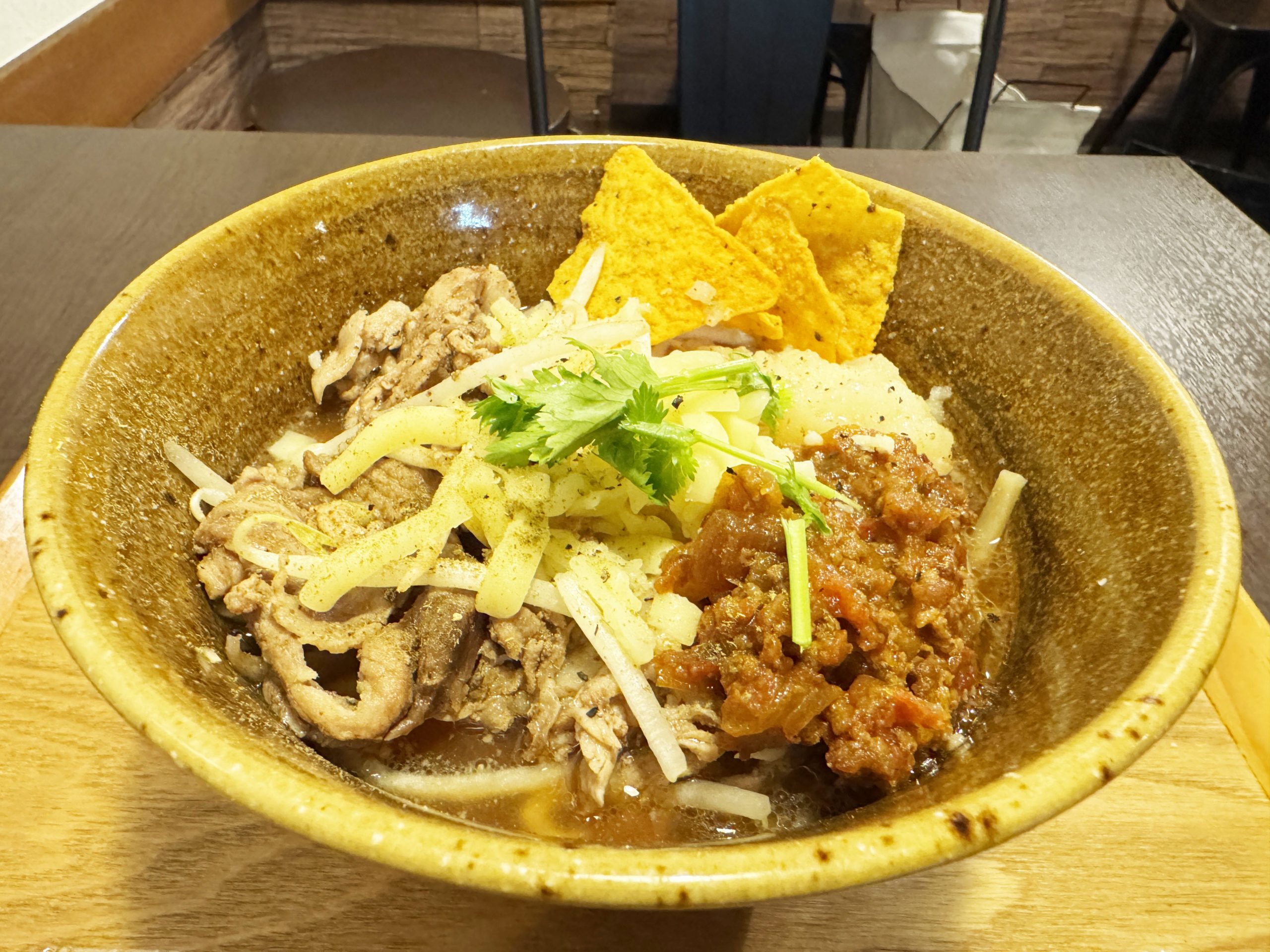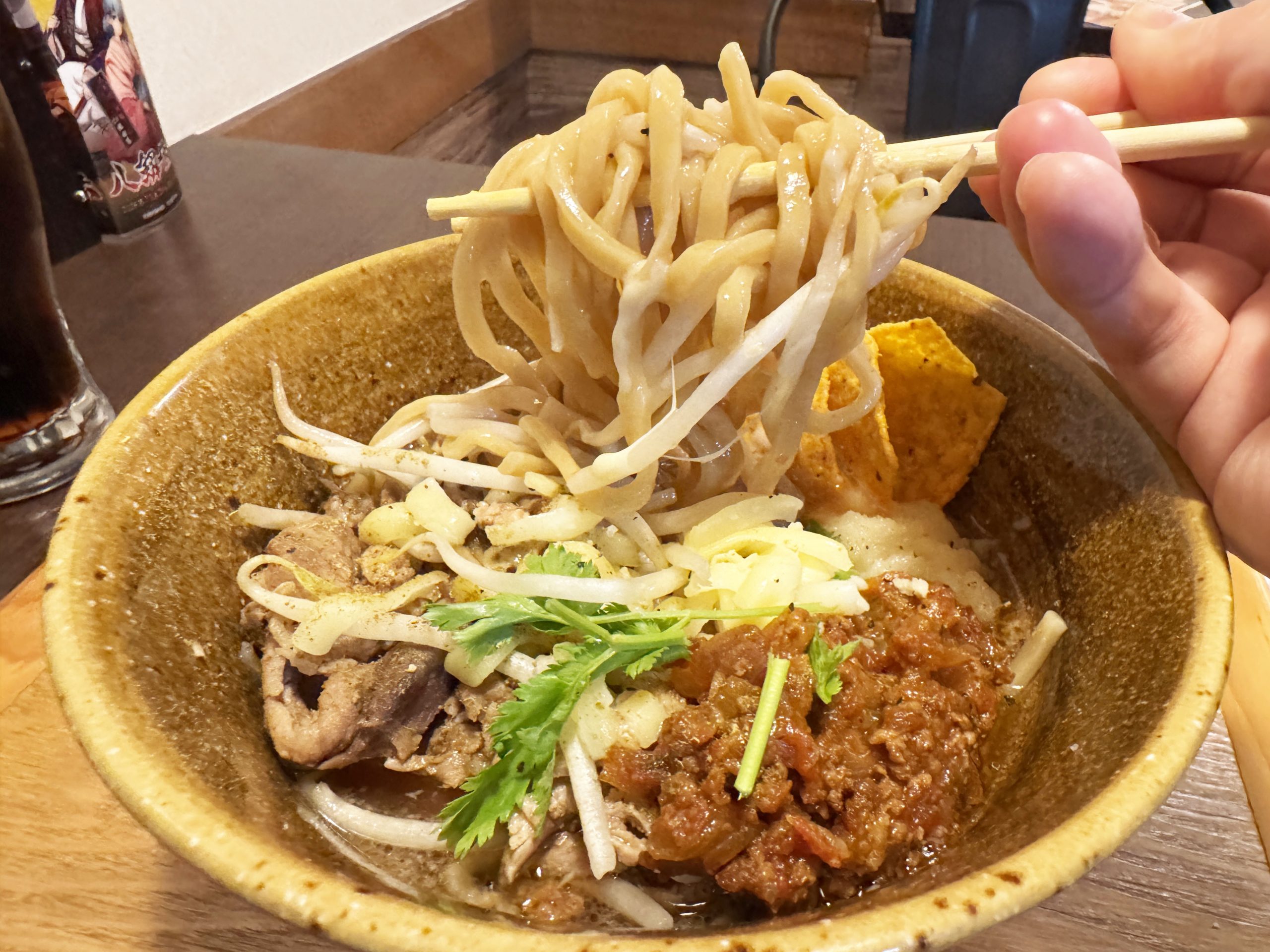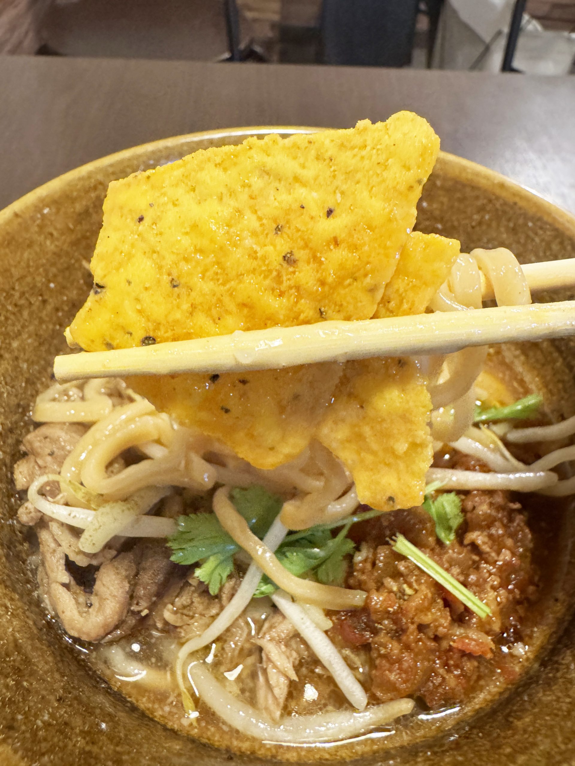 トルティーヤチップスと麺を同時に食べれば、ザクザクとバキボキのダブル食感が楽しめるのも良き。