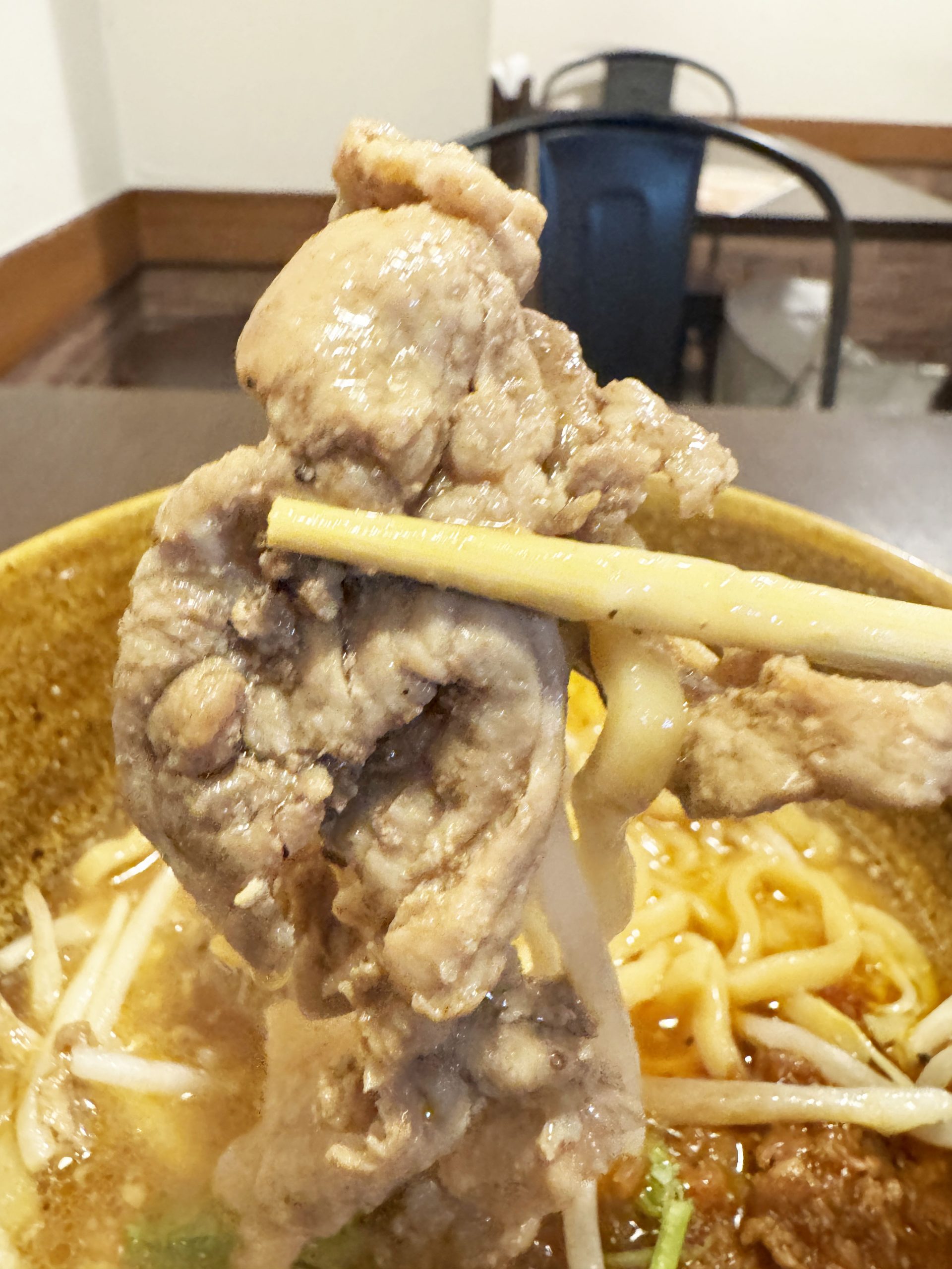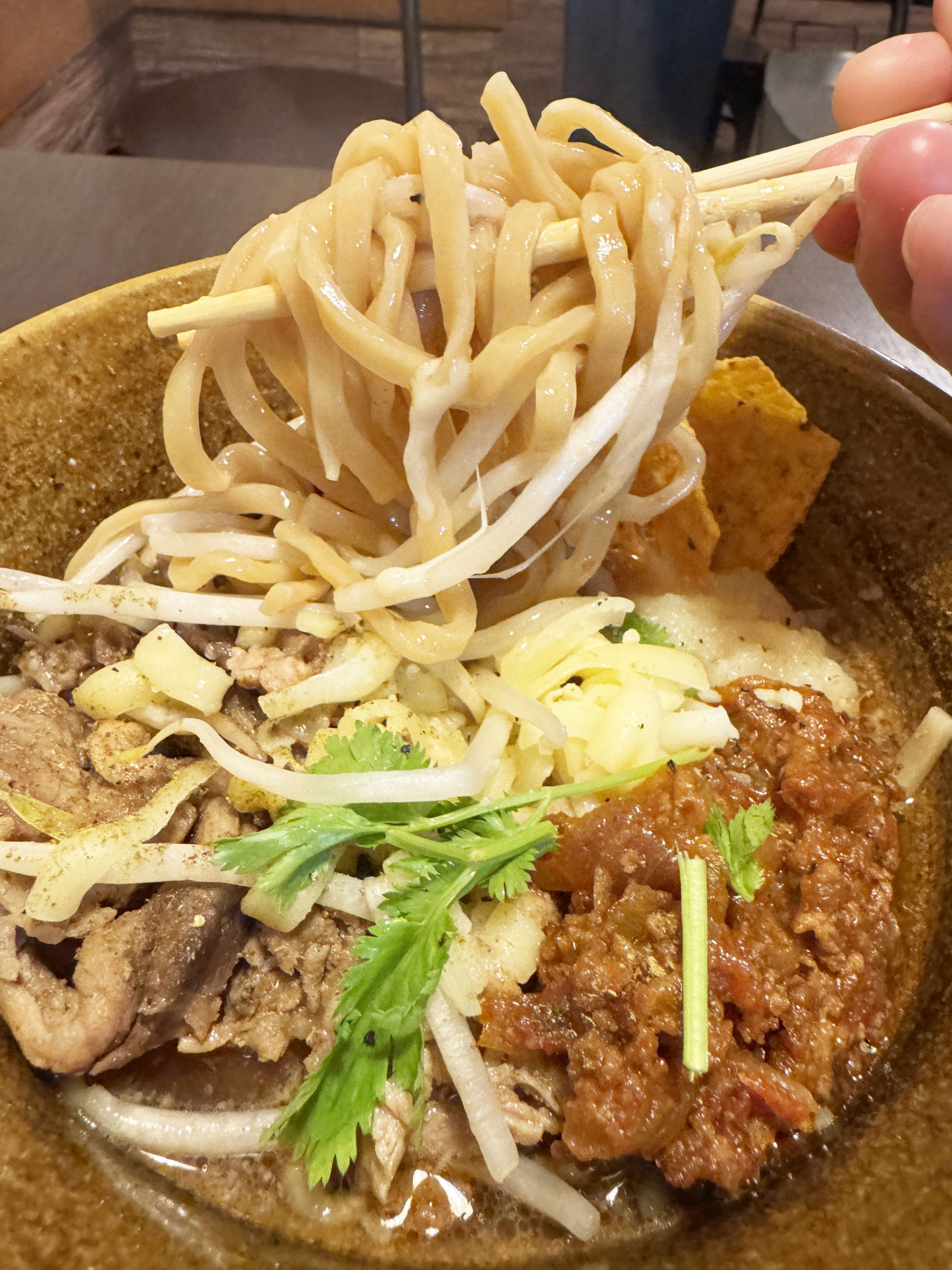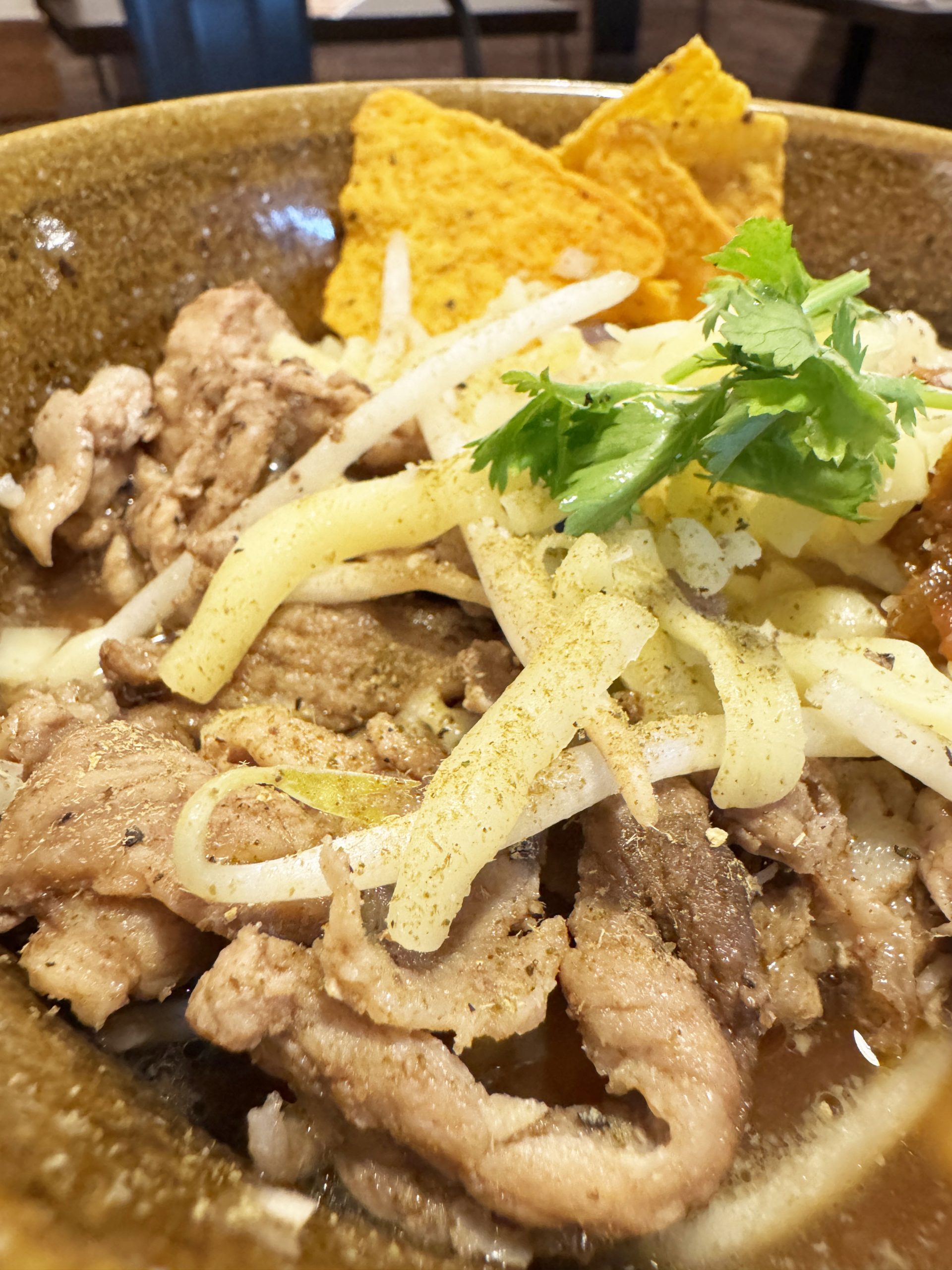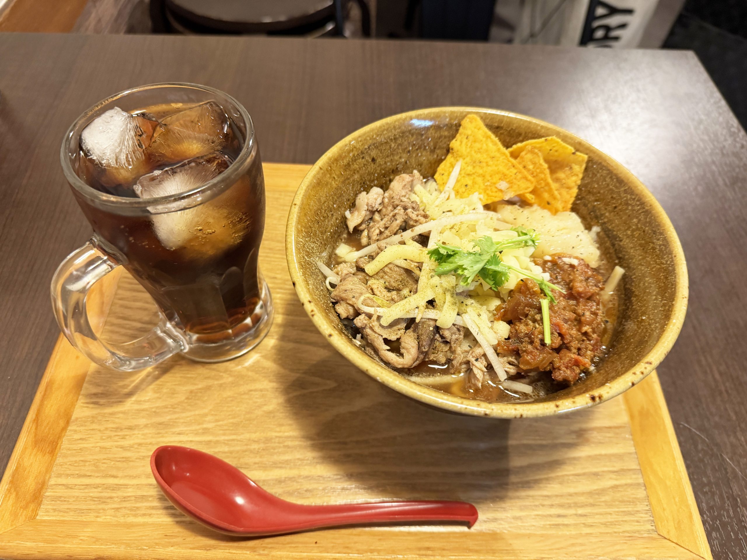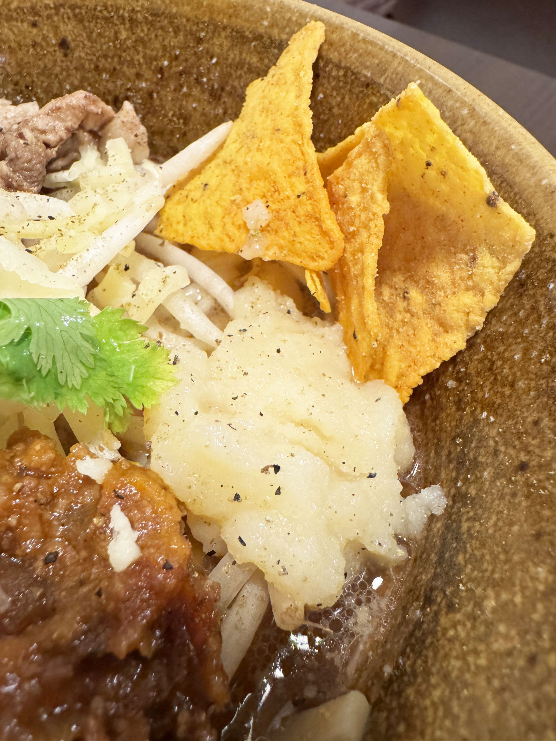 トルティーヤチップスと麺を同時に食べれば、ザクザクとバキボキのダブル食感が楽しめるのも良き。