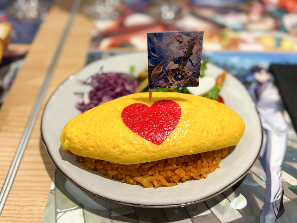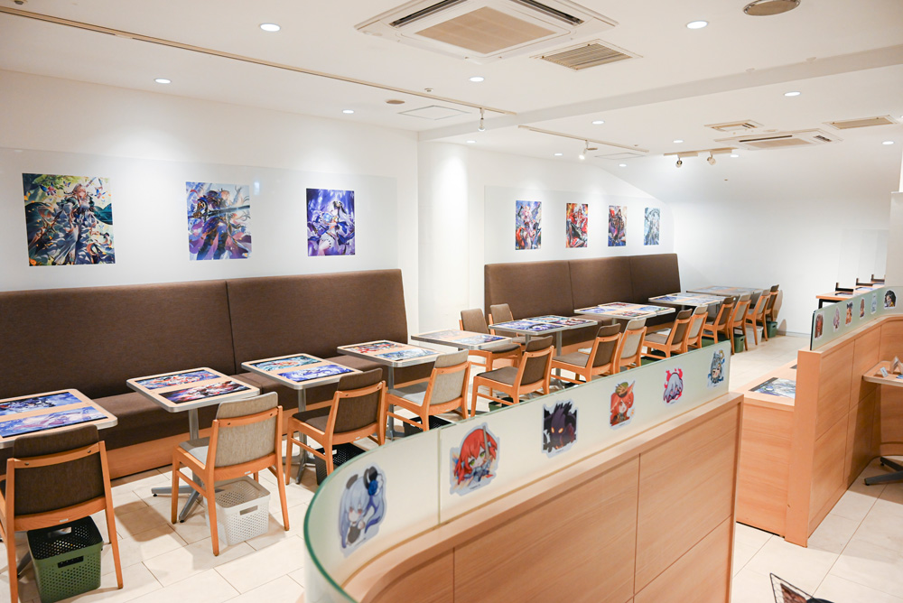 店内に一歩足を踏み入れると、テーブルに貼られたレジェンドカードのイラストが目に飛び込んでくる。どのテーブルに案内されるかはランダムなので、自分の推しキャラに出会えるかどうかは完全に運任せ。ここは“運が試される”コラボカフェと言っていいだろう。「これも運……」。