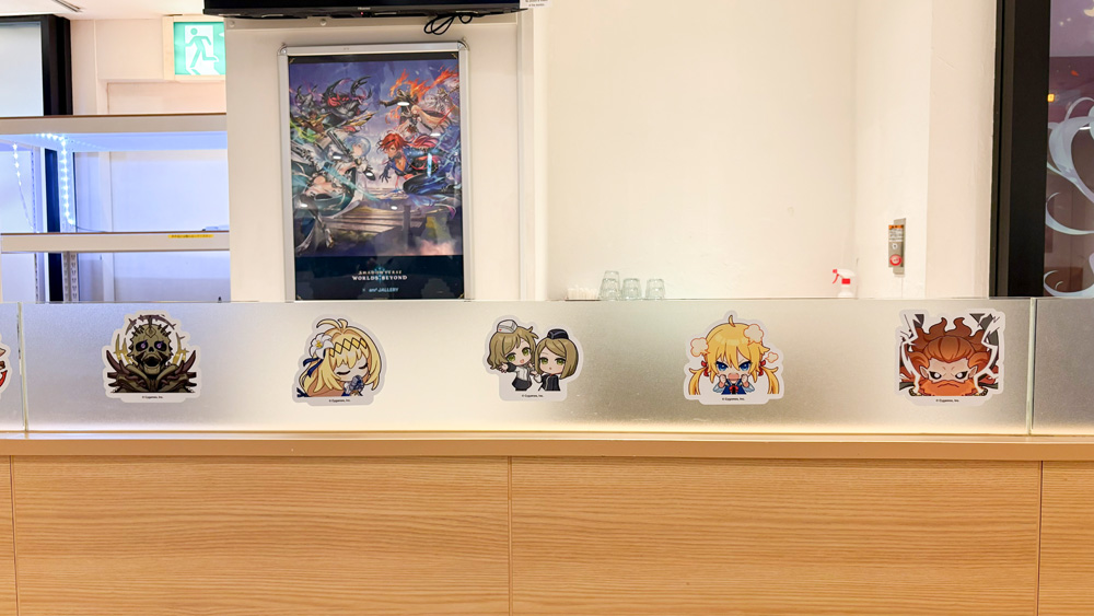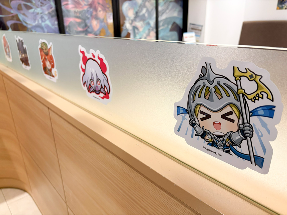 また、店内中央付近にあるガラス張りの仕切りには、ゲーム内のパークやバトル観戦で使えるおなじみのスタンプ柄シールがずらっと貼られている。ゆるい感じのイラストがじつに可愛い。