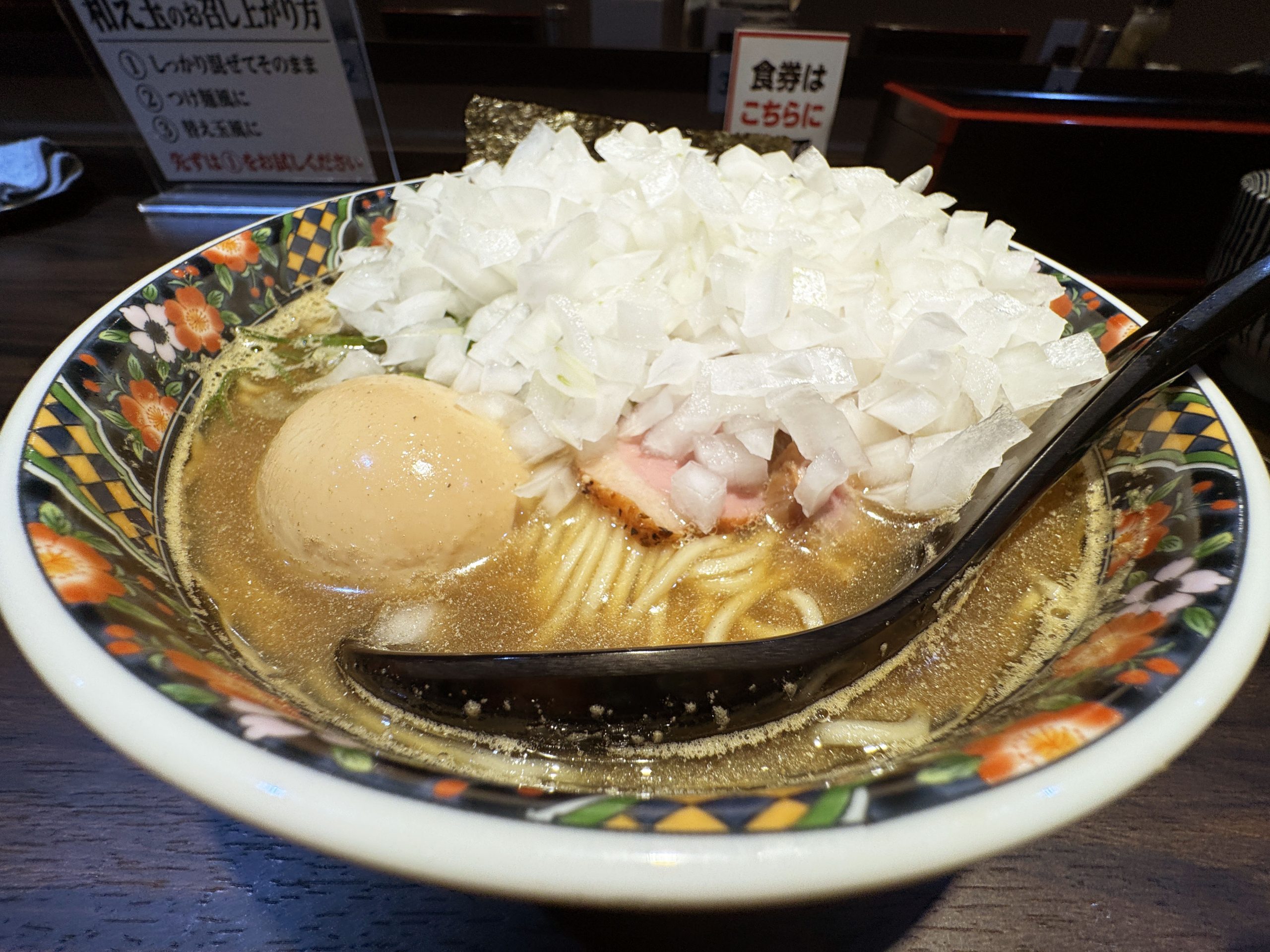 筆者が最適解だと感じたゲキウマな食べ方、それが「ラーメン+タマネギ2倍」である。お好みで煮卵をプラスしても良い。この食べ方をすることで、徹底的に「ゲキウマなスープを有効利用」できるのである。