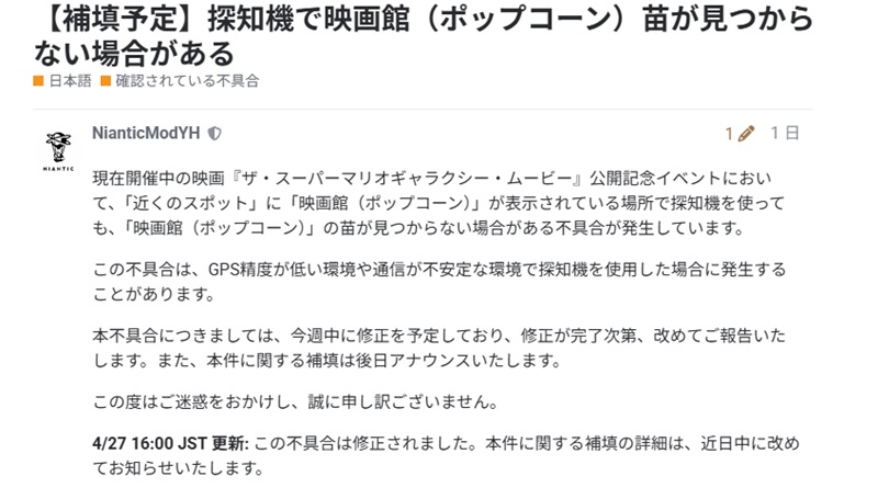 この問題に関して公式アナウンスによれば4月27日(月)16:00に修正が完了。