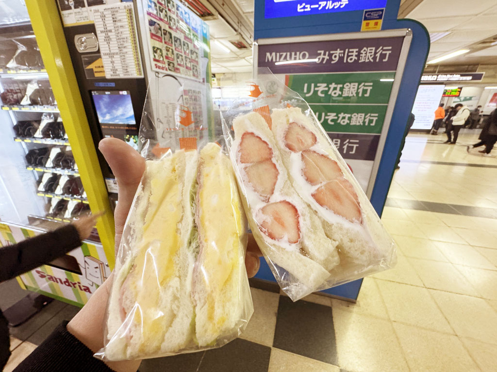 ということで、実際に購入してみた。今回購入したのはイチゴクリームとダブルタマゴのサンドイッチ。どちらも人気のサンドイッチ。驚くことに、ダブルタマゴのサンドイッチはガッツリとタマゴが入っているのに低価格。そもそも、あまりにも低額すぎて赤字なのでは!? と心配してしまうほど激安価格である。