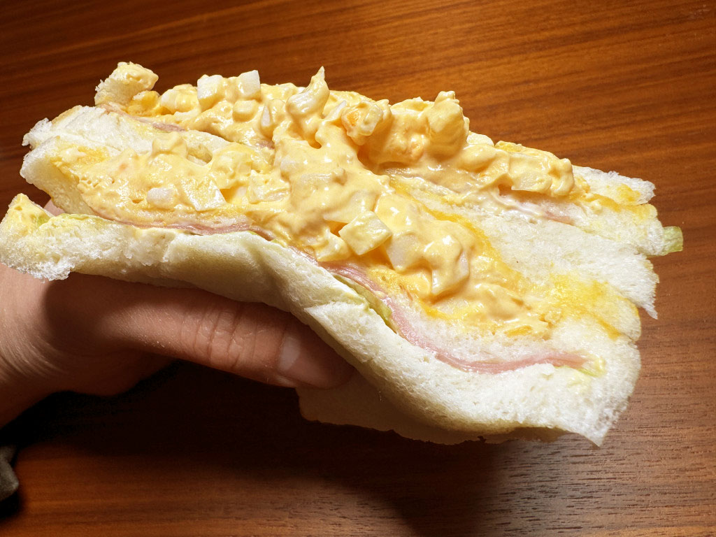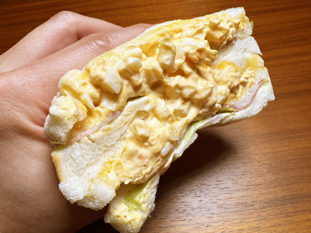 その味、驚くほどおいしい。うまい、うますぎる。ダブルタマコサンドイッチの食パンは超シットリしてて、タマゴはたっぷりトロトロ。あまりにもタマゴが多すぎて、手にするだけであふれてくる。そして強いコクと旨味、たまらない。