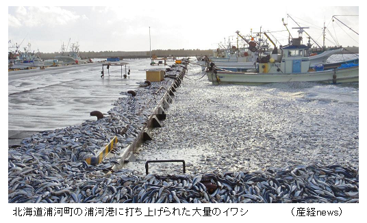 北海道で2件、イワシが漂着する事件が起きた。3日朝から4日にかけて、むかわ町で、5日から6日未明にかけては浦河町で大量のマイワシが打ち上げられた。 生きているものを持って帰る人もいた。海岸近くに住むとこんないいこともあるのだね。たが、大半は死んでいて腐ってしまって、処分が大変だ。一部は堆肥や飼料に加工されるという。 ちょうどこのころ、南方では台風20号が通過、北海道では低気圧が通過、しけが続き海水がかき混ぜられて、急激な温度の変化があったのではないかと考えられている。 北海道むかわ町では、11月3日朝から4日にかけ、海岸沿いの約4キロにわたって大量の死んだイワシが漂着しているのが見つかった。原因ははっきり分かっておらず、回収作業に追われた地元漁協の関係者らが首をかしげた。 鵡川漁協によると、イワシは大きいもので体長25センチほどのマイワシ。4日午後までに職員らがスコップなどを使って、打ち上げられた約20トンを回収した。岸に近い海面を覆い尽くすように死骸が浮かんでいるが、波が高いため、回収が難航しているという。 漁協職員の赤石秀敏さん(53)は「これほど大量に打ち上がったのは見たことがない。原因が思い当たらず、本当に不思議だ」と驚いていた。 北海道浦河町の浦河港では、5日から6日未明にかけて大量のマイワシが入り込んで港を埋め、町や漁協関係者らが回収作業に追われた。3日にはむかわ町沿岸のむかわ漁港などに約20トンのマイワシが打ち上げられたばかり。東胆振、日高沿岸でのマイワシ「異変」に、漁業者らは「こんなことは記憶にない」と驚いている。 |