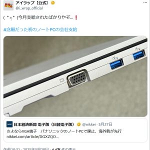 パナソニックがノートパソコンのVGA端子廃止へ / アイラップの中の人「今月支給されたばかりやぞ」